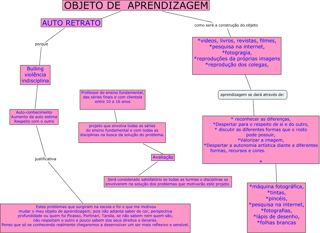 Esse mapa conceitual, produzido no IHMC CmapTools, tem a informação relacionada a: objeto de aprendizagem, * reconhecer as diferenças, *Despertar para o respeito de si e do outro, * discutir as diferentes formas que o rosto pode possuir, *Valorizar a imagem, *Despertar a autonomia artística diante a diferentes formas, recursos e cores. * ???? *máquina fotográfica, *tintas, *pincéis, *pesquisa na internet, *fotografias, *lápis de desenho, *folhas brancas, aprendizagem se dará através de: ???? * reconhecer as diferenças, *Despertar para o respeito de si e do outro, * discutir as diferentes formas que o rosto pode possuir, *Valorizar a imagem, *Despertar a autonomia artística diante a diferentes formas, recursos e cores. *, Professor do ensino fundamental, das séries finais e com clientela entre 10 a 16 anos ???? projeto que envolva todas as séries do ensino fundamental e com todas as disciplinas na busca da solução do problema., OBJETO DE APRENDIZAGEM ???? AUTO RETRATO, projeto que envolva todas as séries do ensino fundamental e com todas as disciplinas na busca da solução do problema. ???? Avaliação, AUTO RETRATO porque Auto-conhecimento Aumento da auto estima Respeito com o outro, Auto-conhecimento Aumento da auto estima Respeito com o outro justificativa Estes problemas que surgiram na escola e foi o que me motivou mudar o meu objeto de aprendizagem, pois não adianta saber de cor, perspectiva profundidade ou quem foi Picasso, Portinari, Tarsila, se não sabem nem quem são, não respeitam o outro e pouco sabem dos seus direitos e deveres. Penso que só se conhecendo realmente chegaremos a desenvolver um ser mais reflexivo e sensível., Avaliação ???? Será considerado satisfatório se todas as turmas e disciplinas se envolverem na solução dos problemas que motivarão este projeto., OBJETO DE APRENDIZAGEM como será a construção do objeto aprendizagem se dará através de:
