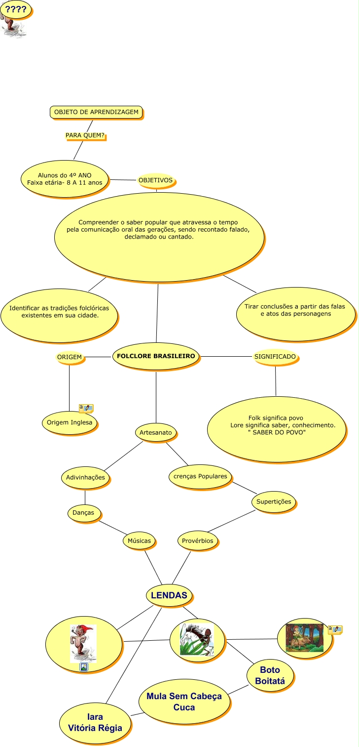 Esse mapa conceitual, produzido no IHMC CmapTools, tem a informação relacionada a: objeto de aprendizagem, Iara Vitória Régia ???? Mula Sem Cabeça Cuca, Adivinhações ???? Danças, Compreender o saber popular que atravessa o tempo pela comunicação oral das gerações, sendo recontado falado, declamado ou cantado. ???? Identificar as tradições folclóricas existentes em sua cidade., Danças ???? Músicas, Músicas ???? LENDAS, Provérbios ???? LENDAS, FOLCLORE BRASILEIRO ???? Artesanato, Supertições ???? Provérbios, FOLCLORE BRASILEIRO ORIGEM Origem Inglesa, Compreender o saber popular que atravessa o tempo pela comunicação oral das gerações, sendo recontado falado, declamado ou cantado. ???? FOLCLORE BRASILEIRO, ????, FOLCLORE BRASILEIRO SIGNIFICADO Folk significa povo Lore significa saber, conhecimento. " SABER DO POVO", OBJETO DE APRENDIZAGEM PARA QUEM? Alunos do 4º ANO Faixa etária- 8 A 11 anos, Compreender o saber popular que atravessa o tempo pela comunicação oral das gerações, sendo recontado falado, declamado ou cantado. ???? Tirar conclusões a partir das falas e atos das personagens, Boto Boitatá ???? Mula Sem Cabeça Cuca, LENDAS ???? Boto Boitatá, Artesanato ???? Adivinhações, LENDAS ????, crenças Populares ???? Supertições, Artesanato ???? crenças Populares
