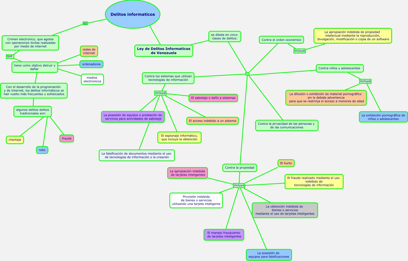This Concept Map, created with IHMC CmapTools, has information related to: delitos, tiene como objtivo detruir y dañar ???? redes de internet, se dibide en cinco clases de delitos: * Contra el orden económico, tiene como objtivo detruir y dañar ???? medios electronicos, Contra los sistemas que utilizan tecnologías de información incluye La posesión de equipos o prestación de servicios para actividades de sabotaje, Delitos informaticos ???? Ley de Delitos Informaticos de Venezuela, Contra los sistemas que utilizan tecnologías de información incluye El sabotaje o daño a sistemas, Con el desarrollo de la programación y de Internet, los delitos informáticos se han vuelto más frecuentes y sofisticados. ???? algunos delitos delitos tradicionales son:, Contra los sistemas que utilizan tecnologías de información incluye El espionaje informático, que incluye la obtención, se dibide en cinco clases de delitos: * Contra la propiedad, Contra la propiedad incluye El hurto, Delitos informaticos es Crimen electronico, que agobia con operaciones ilicitas realizadas por medio de internet, algunos delitos delitos tradicionales son: ???? robo, algunos delitos delitos tradicionales son: ???? chantaje, Contra niños y adolescentes incluye La difusión o exhibición de material pornográfico sin la debida advertencia para que se restrinja el acceso a menores de edad, se dibide en cinco clases de delitos: * Contra niños y adolescentes, Contra la propiedad incluye La obtención indebida de bienes o servicios mediante el uso de tarjetas inteligentes, Contra la propiedad incluye Provisión indebida de bienes o servicios utilizando una tarjeta inteligente, se dibide en cinco clases de delitos: * Contra los sistemas que utilizan tecnologías de información, tiene como objtivo detruir y dañar ???? Con el desarrollo de la programación y de Internet, los delitos informáticos se han vuelto más frecuentes y sofisticados., Contra niños y adolescentes incluye La exhibición pornográfica de niños o adolescentes