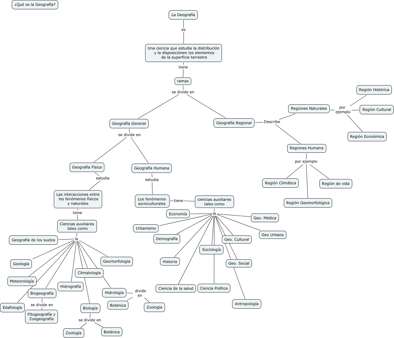 Este Cmap, tiene información relacionada con: la Geografía, ciencias auxiliares tales como la Geo. Social, Geografía General se divide en Geografía Física, Ciencias auxiliares tales como la Geomorfología, Biología se divide en Zoología, La Geografía es Una ciencia que estudia la distribución y la disposiciónen los elementos de la superficie terrestre, Ciencias auxiliares tales como la Biogeografía, ciencias auxiliares tales como la Demografía, ciencias auxiliares tales como la Ciencia de la salud, ciencias auxiliares tales como la Antropología, Geografía General se divide en Geografía Humana, Ciencias auxiliares tales como la Hidrografía, Regiones Naturales por ejemplo Región Histórica, Ciencias auxiliares tales como la Climatología, ciencias auxiliares tales como la Geo Urbana, Biología se divide en Botánica, Geografía Regional Describe Regiones Naturales, ciencias auxiliares tales como la Geo. Médica, Geografía Física estudia Las interacciones entre los fenómenos físicos y naturales, Hidrología divide en Botánica, Ciencias auxiliares tales como la Meteorología