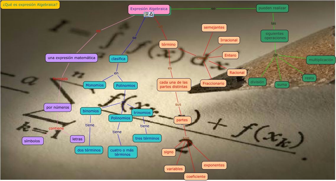 Este Cmap, tiene información relacionada con: mapa para entregar, Polinomios en binomios, cada una de las partes distintas sus partes, trinomios tiene tres términos, una expresión matemática formada por números, término clases Entero, Expresión Algebraica se clasifica, Expresión Algebraica es una expresión matemática, término clases Irracional, término clases Fraccionario, siguientes operaciones de división, término clases semejantes, Polinomios tiene cuatro o más términos, siguientes operaciones de multiplicación, Polinomios en trinomios, siguientes operaciones de resta, por números contiene letras, clasifica en Monomios, Polinomios en Polinomios, Expresión Algebraica un término, partes son coeficiente