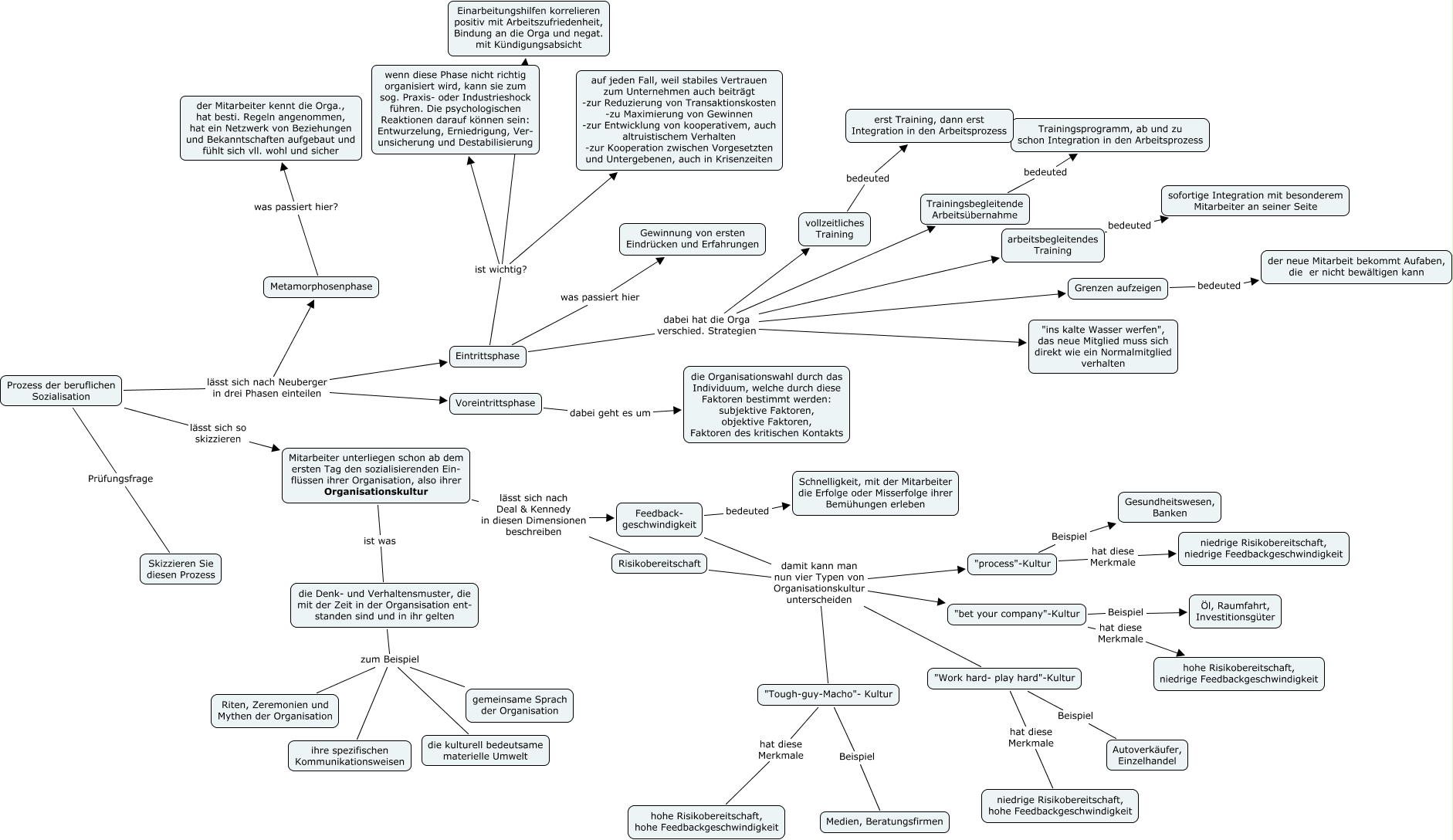 Dieses mit IHMC CmapTools erstellte CMap hat Informationen bezüglich: 4. Berufliche Sozialisation, Eintrittsphase was passiert hier Gewinnung von ersten Eindrücken und Erfahrungen, die Denk- und Verhaltensmuster, die mit der Zeit in der Organsisation ent- standen sind und in ihr gelten zum Beispiel gemeinsame Sprach der Organisation, "Tough-guy-Macho"- Kultur hat diese Merkmale hohe Risikobereitschaft, hohe Feedbackgeschwindigkeit, Mitarbeiter unterliegen schon ab dem ersten Tag den sozialisierenden Ein- flüssen ihrer Organisation, also ihrer Organisationskultur ist was die Denk- und Verhaltensmuster, die mit der Zeit in der Organsisation ent- standen sind und in ihr gelten, Eintrittsphase ist wichtig? wenn diese Phase nicht richtig organisiert wird, kann sie zum sog. Praxis- oder Industrieshock führen. Die psychologischen Reaktionen darauf können sein: Entwurzelung, Erniedrigung, Ver- unsicherung und Destabilisierung, vollzeitliches Training bedeuted erst Training, dann erst Integration in den Arbeitsprozess, Risikobereitschaft damit kann man nun vier Typen von Organisationskultur unterscheiden "Tough-guy-Macho"- Kultur, Eintrittsphase dabei hat die Orga verschied. Strategien Grenzen aufzeigen, Eintrittsphase ist wichtig? auf jeden Fall, weil stabiles Vertrauen zum Unternehmen auch beiträgt -zur Reduzierung von Transaktionskosten -zu Maximierung von Gewinnen -zur Entwicklung von kooperativem, auch altruistischem Verhalten -zur Kooperation zwischen Vorgesetzten und Untergebenen, auch in Krisenzeiten, Prozess der beruflichen Sozialisation lässt sich nach Neuberger in drei Phasen einteilen Eintrittsphase, Eintrittsphase dabei hat die Orga verschied. Strategien arbeitsbegleitendes Training, Feedback- geschwindigkeit damit kann man nun vier Typen von Organisationskultur unterscheiden "Tough-guy-Macho"- Kultur, Mitarbeiter unterliegen schon ab dem ersten Tag den sozialisierenden Ein- flüssen ihrer Organisation, also ihrer Organisationskultur lässt sich nach Deal & Kennedy in diesen Dimensionen beschreiben Feedback- geschwindigkeit, Eintrittsphase dabei hat die Orga verschied. Strategien "ins kalte Wasser werfen", das neue Mitglied muss sich direkt wie ein Normalmitglied verhalten, Feedback- geschwindigkeit bedeuted Schnelligkeit, mit der Mitarbeiter die Erfolge oder Misserfolge ihrer Bemühungen erleben, die Denk- und Verhaltensmuster, die mit der Zeit in der Organsisation ent- standen sind und in ihr gelten zum Beispiel die kulturell bedeutsame materielle Umwelt, arbeitsbegleitendes Training bedeuted sofortige Integration mit besonderem Mitarbeiter an seiner Seite, Risikobereitschaft damit kann man nun vier Typen von Organisationskultur unterscheiden "Work hard- play hard"-Kultur, die Denk- und Verhaltensmuster, die mit der Zeit in der Organsisation ent- standen sind und in ihr gelten zum Beispiel Riten, Zeremonien und Mythen der Organisation, Prozess der beruflichen Sozialisation Prüfungsfrage Skizzieren Sie diesen Prozess