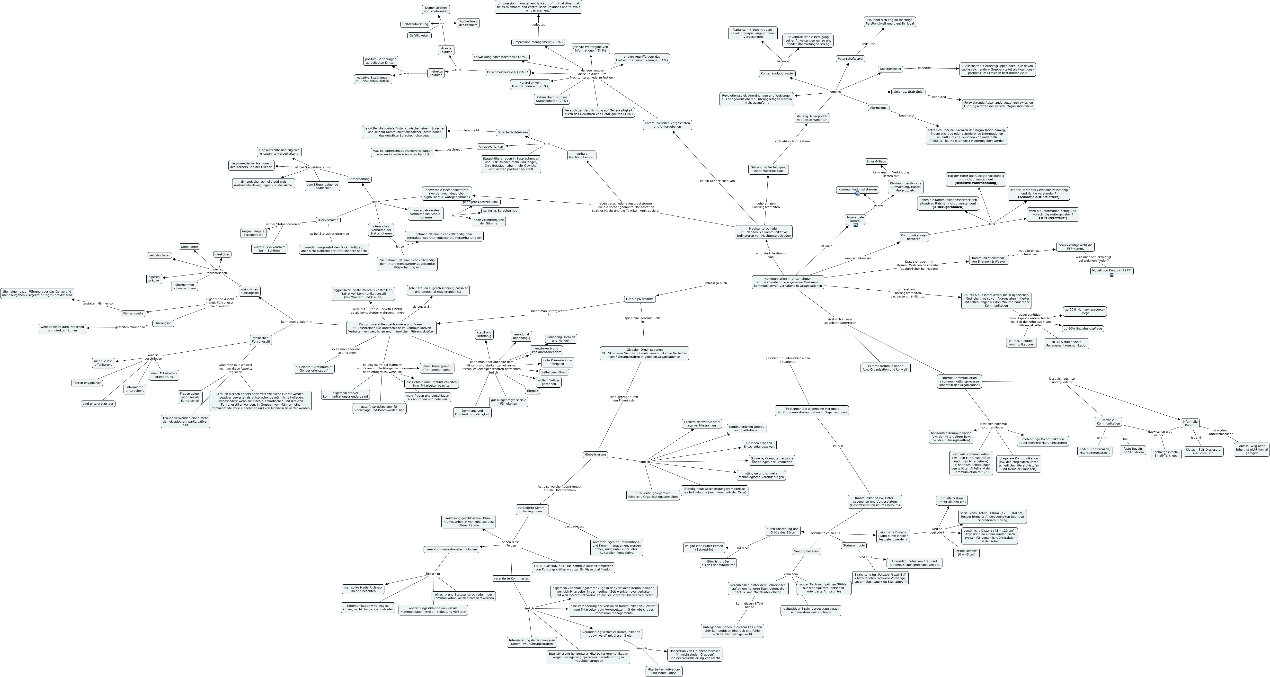 Dieses mit IHMC CmapTools erstellte CMap hat Informationen bezüglich: 6. Kommunikation, Einschmeicheltaktik (25%)* sind direkte Taktiken, Globalisierung nämlich ständige und schnelle technologische Veränderungen, veränderte Komm.arten nämlich Veränderung vertikaler Kommunikation „downward“ mit diesen Zielen, nonverbale Machtindikatoren (werden noch deutlicher signalisiert u. wahrgenommen) sind räumliches Verhalten bei Statushöheren, PF: Nennen Sie allgemeine Merkmale der Kommunikationssituation in Organisationen ist z. B. Kommunikation zw. Unter- gebenenen und Vorgesetztem (Gesamtsituation ist im Chefbüro), direkte Taktiken wie Demonstration von Konformität, Konterrevolutionsspiel bedeuted Variante mit dem mit dem Revolutionsspiel angegriffenen Vorgesetzten, weiblichen Führungsstil wird so beschrieben mehr Mitarbeiter- orientierung, nonverbale Machtindikatoren (werden noch deutlicher signalisiert u. wahrgenommen) sind Körperhaltung, neue Kommunikationstechnologien führen zu o Macht- und Statusunterschiede in der Kommunikation werden nivelliert werden, männlichen Führungsstil wird so beschrieben direktiver, verbale Machtindikatoren sind Anredevarianten, 75- 90% aus interaktiver, meist dyadischer, mündlicher, meist vom Vorgestzten initierter und selten länger als drei Minuten dauernder Kommunikation dabei benötigen diese Aspekte unterschiedlich viel Zeit der Arbeitszeit von Führungskräften zu 30% Routine- kommunikationen, interne Kommunikation (Kommunikationsprozesse innerhalb der Organisation) lässt sich auch so untergliedern formale Kommunikation, Seating behavior kann sein Sitzenbleiben hinter dem Schreibtisch, auf einem höheren Stuhl betont die Status- und Machtunterschiede, veränderte Komm.- bedingungen das bedeuted Anforderungen an Inforamtions- und Komm.management werden höher, auch unter einer inter- kulturellen Perspektive, männlichen Führungsstil wird so beschrieben agieren präziser, Sprachschichtniveau beschreibt Je größer die soziale Distanz zwischen einem Sprecher und seinem Kommunikationspartner, desto höher das gewählte Sprachschichtniveau, Kommunkation in Unternehmen PF: Beschreiben Sie allgemeine Merkmale kommunikativen Verhaltens in Organisationen kann scheitern an Kommunikations- barrieren, informelle Komm. ist wodurch unterschiedlich? Anlass, Weg oder Inhalt ist nicht formal geregelt