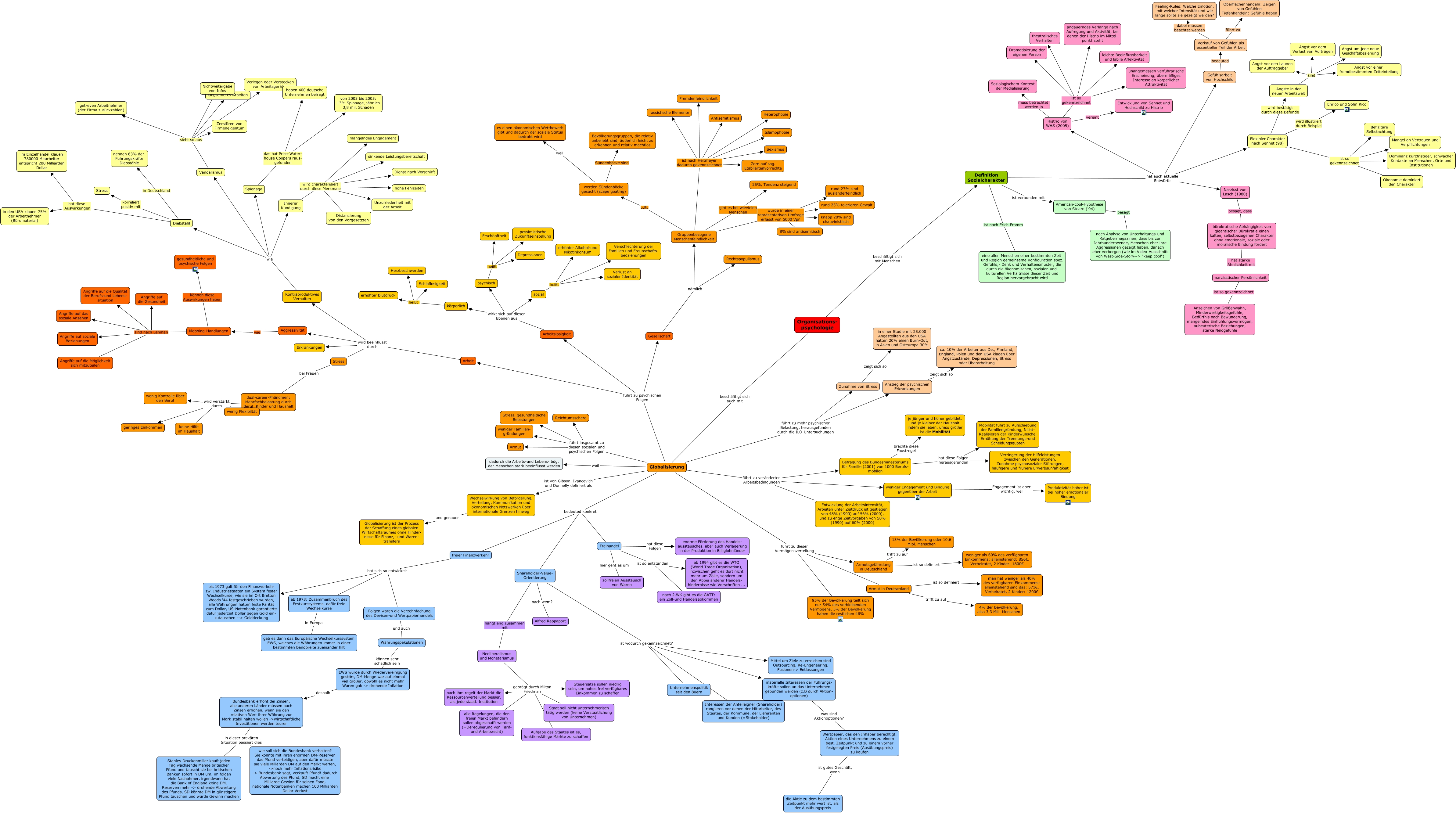 Dieses mit IHMC CmapTools erstellte CMap hat Informationen bezüglich: 1.Orga 1 Sozialcharakter und Globalisierung, Definition Sozialcharakter hat auch aktuelle Entwürfe Histrio von WHS (2005), Arbeit wird beeinflusst durch Erkrankungen, psychisch heißt Depressionen, Globalisierung führt zu dieser Vermögensverteilung 95% der Bevölkerung teilt sich nur 54% des verbleibenden Vermögens, 5% der Bevölkerung haben die restlichen 46%, narzisstischer Persönlichkeit ist so gekennzeichnet Anzeichen von Größenwahn, Minderwertigkeitsgefühle, Bedürfnis nach Bewunderung, mangelndes Einflühlungsvermögen, aubeuterische Beziehungen, starke Neidgefühle, körperlich heißt Herzbeschwerden, Flexibler Charakter nach Sennet (98) wird illustriert durch Beispiel Enrico und Sohn Rico, Shareholder-Value- Orientierung nach wem? Alfred Rappaport, Spionage das hat Price-Water- house Coopers raus- gefunden von 2003 bis 2005: 13% Spionage, jährlich 3,8 mil. Schaden, Gruppenbezogene Menschenfeindlichkeit ist nach Heitmeyer dadurch gekennzeichnet Heterophobie, Mobbing-Handlungen sind nach Lehman Angriffe auf soziale Beziehungen, Histrio von WHS (2005) muss betrachtet werden in Soziologischem Kontext der Medialisierung, Spionage das hat Price-Water- house Coopers raus- gefunden haben 400 deutsche Unternehmen befragt, Arbeit wird beeinflusst durch Stress, Globalisierung führt zu psychischen Folgen Arbeit, Histrio von WHS (2005) ist so gekennzeichnet Dramatisierung der eigenen Person, Histrio von WHS (2005) vereint Entwicklung von Sennet und Hochschild zu Histrio, Narzisst von Lasch (1980) besagt, dass bürokratische Abhängigkeit von gigantischer Bürokratie einen kalten, selbstbezogenen Charakter ohne emotionale, soziale oder moralische Bindung fördert, psychisch heißt Erschöpftheit, werden Sündenböcke gesucht (scape goating) weil es einen ökonomischen Wettbewerb gibt und dadurch der soziale Status bedroht wird