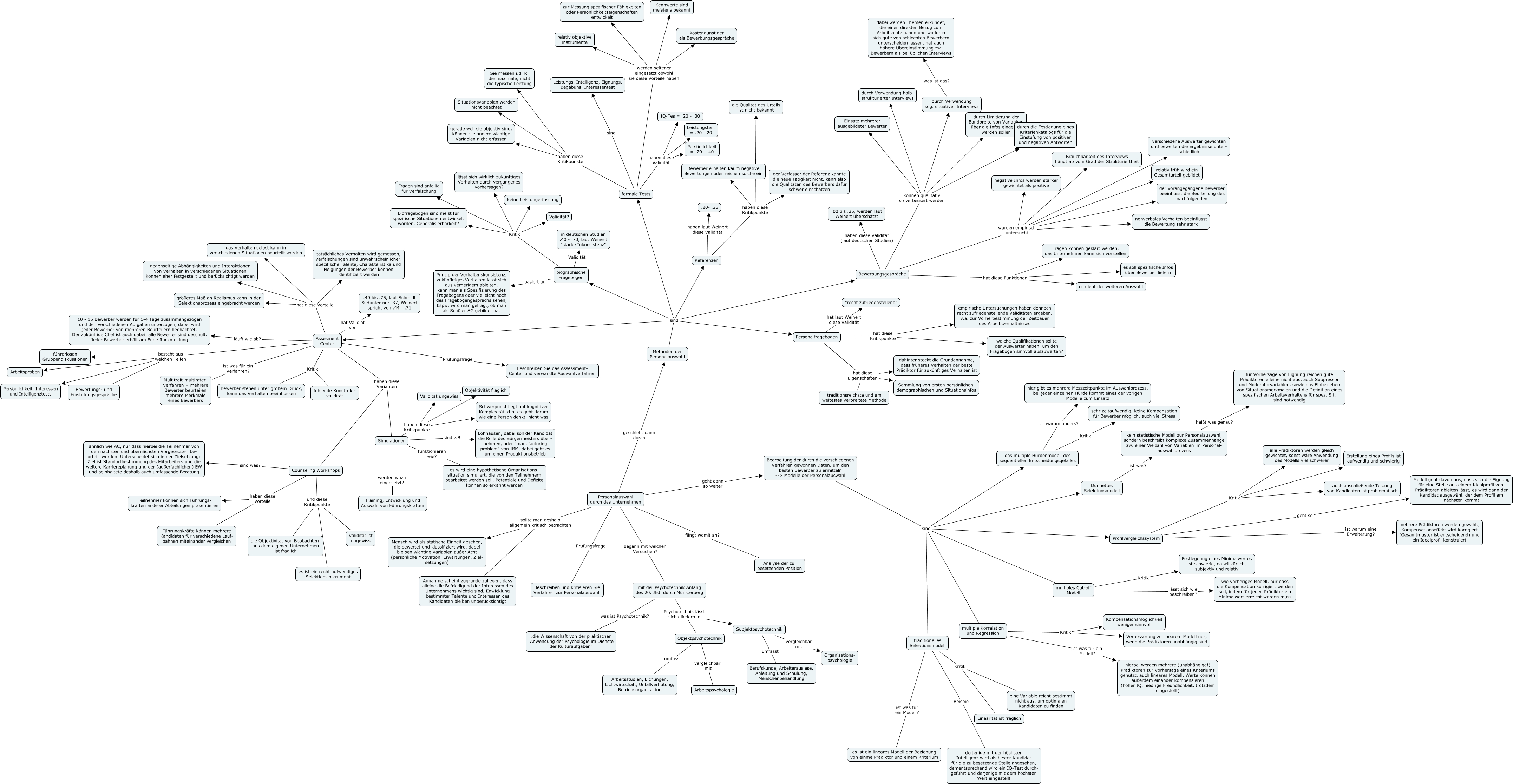 Dieses mit IHMC CmapTools erstellte CMap hat Informationen bezüglich: 3. Personalauswahl durch das Unternehmen, multiples Cut-off Modell Kritik Festlegeung eines Minimalwertes ist schwierig, da willkürlich, subjektiv und relativ, Assesment Center haben diese Varianten Counseling Workshops, formale Tests werden seltener eingesetzt obwohl sie diese Vorteile haben relativ objektive Instrumente, multiple Korrelation und Regression Kritik Verbesserung zu linearem Modell nur, wenn die Prädiktoren unabhängig sind, Methoden der Personalauswahl sind formale Tests, Personalauswahl durch das Unternehmen Prüfungsfrage Beschreiben und kritisieren Sie Verfahren zur Personalauswahl, Simulationen sind z.B. Lohhausen, dabei soll der Kandidat die Rolle des Bürgermeisters über- nehmen, oder "manufactoring problem" von IBM, dabei geht es um einen Produktionsbetrieb, das multiple Hürdenmodell des sequentiellen Entscheidungsgefälles Kritik sehr zeitaufwendig, keine Kompensation für Bewerber möglich, auch viel Stress, Bewerbungsgespräche können qualitativ so verbessert werden durch Verwendung halb- strukturierter Interviews, Counseling Workshops haben diese Vorteile Führungskräfte können mehrere Kandidaten für verschiedene Lauf- bahnen miteinander vergleichen, biographische Fragebogen basiert auf Prinzip der Verhaltenskonsistenz, zukünfktiges Verhalten lässt sich aus verherigem ableiten, kann man als Spezifizierung des Fragebogens oder vielleicht noch des Fragebogengesprächs sehen, bspw. wird man gefragt, ob man als Schüler AG gebildet hat, formale Tests haben diese Validität Leistungstest = .20 -.20, Counseling Workshops sind was? ähnlich wie AC, nur dass hierbei die Teilnehmer von den nächsten und übernächsten Vorgesetzten be- urteilt werden. Unterscheidet sich in der Zielsetzung: Ziel ist Standortbestimmung des Mitarbeiters und die weitere Karriereplanung und der (außerfachlichen) EW und beinhaltete deshalb auch umfassende Beratung, Simulationen werden wozu eingesetzt? Training, Entwicklung und Auswahl von Führungskräften, formale Tests haben diese Kritikpunkte gerade weil sie objektiv sind, können sie andere wichtige Variablen nicht erfassen, biographische Fragebogen Kritik Fragen sind anfällig für Verfälschung, Methoden der Personalauswahl sind Assesment Center, Assesment Center Prüfungsfrage Beschreiben Sie das Assessment- Center und verwandte Auswahlverfahren, biographische Fragebogen Kritik keine Leistungerfassung, Objektpsychotechnik vergleichbar mit Arbeitspsychologie