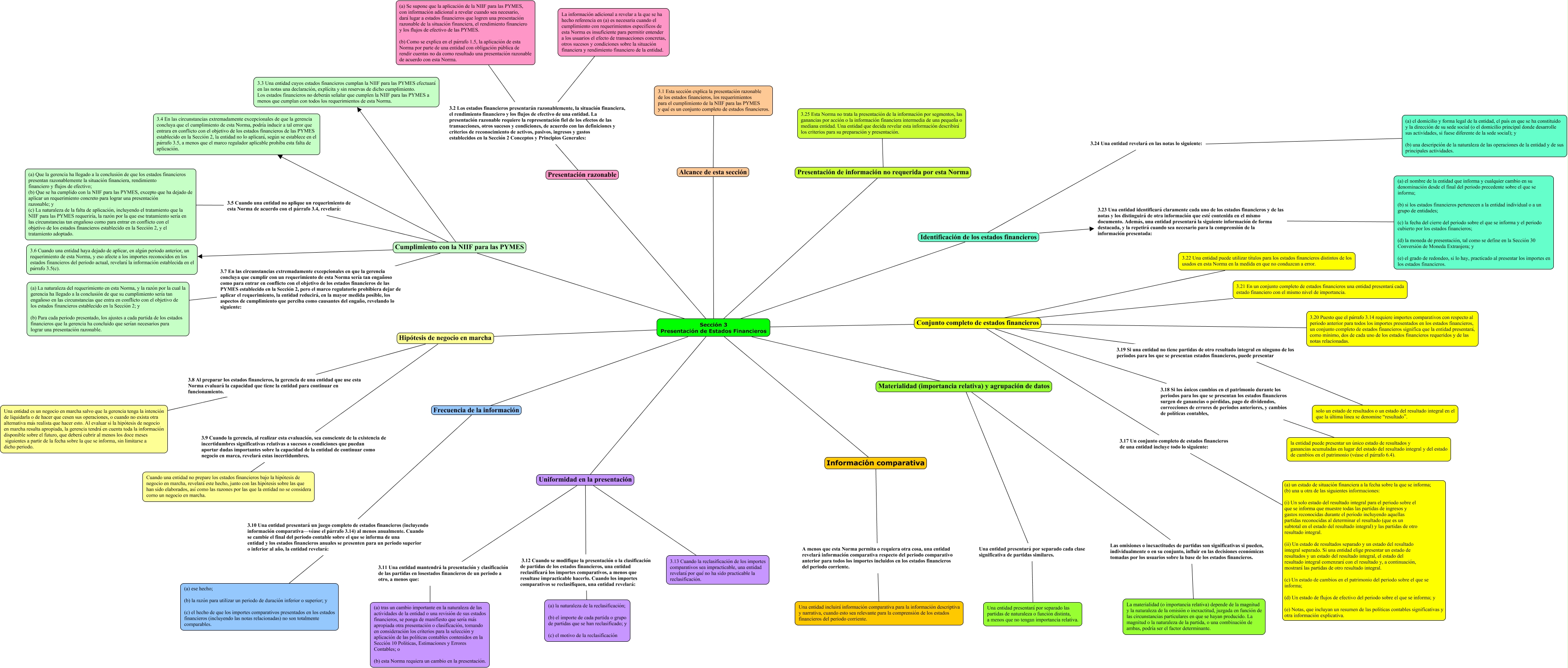 Este Cmap, tiene información relacionada con: 7.1 Teams, Sección 3 Presentación de Estados Financieros Materialidad (importancia relativa) y agrupación de datos Las omisiones o inexactitudes de partidas son significativas si pueden, individualmente o en su conjunto, influir en las decisiones económicas tomadas por los usuarios sobre la base de los estados financieros., 3.2 Los estados financieros presentarán razonablemente, la situación financiera, el rendimiento financiero y los flujos de efectivo de una entidad. La presentación razonable requiere la representación fiel de los efectos de las transacciones, otros sucesos y condiciones, de acuerdo con las definiciones y criterios de reconocimiento de activos, pasivos, ingresos y gastos establecidos en la Sección 2 Conceptos y Principios Generales: ???? La información adicional a revelar a la que se ha hecho referencia en (a) es necesaria cuando el cumplimiento con requerimientos específicos de esta Norma es insuficiente para permitir entender a los usuarios el efecto de transacciones concretas, otros sucesos y condiciones sobre la situación financiera y rendimiento financiero de la entidad., 3.10 Una entidad presentará un juego completo de estados financieros (incluyendo información comparativa—véase el párrafo 3.14) al menos anualmente. Cuando se cambie el final del periodo contable sobre el que se informa de una entidad y los estados financieros anuales se presenten para un periodo superior o inferior al año, la entidad revelará: ???? (a) ese hecho; (b) la razón para utilizar un periodo de duración inferior o superior; y (c) el hecho de que los importes comparativos presentados en los estados financieros (incluyendo las notas relacionadas) no son totalmente comparables., 3.18 Si los únicos cambios en el patrimonio durante los periodos para los que se presentan los estados financieros surgen de ganancias o pérdidas, pago de dividendos, correcciones de errores de periodos anteriores, y cambios de políticas contables, ???? la entidad puede presentar un único estado de resultados y ganancias acumuladas en lugar del estado del resultado integral y del estado de cambios en el patrimonio (véase el párrafo 6.4)., Sección 3 Presentación de Estados Financieros Información comparativa A menos que esta Norma permita o requiera otra cosa, una entidad revelará información comparativa respecto del periodo comparativo anterior para todos los importes incluidos en los estados financieros del periodo corriente., Sección 3 Presentación de Estados Financieros Conjunto completo de estados financieros 3.22 Una entidad puede utilizar títulos para los estados financieros distintos de los usados en esta Norma en la medida en que no conduzcan a error., Sección 3 Presentación de Estados Financieros Cumplimiento con la NIIF para las PYMES 3.5 Cuando una entidad no aplique un requerimiento de esta Norma de acuerdo con el párrafo 3.4, revelará:, Sección 3 Presentación de Estados Financieros Uniformidad en la presentación 3.12 Cuando se modifique la presentación o la clasificación de partidas de los estados financieros, una entidad reclasificará los importes comparativos, a menos que resultase impracticable hacerlo. Cuando los importes comparativos se reclasifiquen, una entidad revelará:, Sección 3 Presentación de Estados Financieros Hipótesis de negocio en marcha 3.9 Cuando la gerencia, al realizar esta evaluación, sea consciente de la existencia de incertidumbres significativas relativas a sucesos o condiciones que puedan aportar dudas importantes sobre la capacidad de la entidad de continuar como negocio en marca, revelará estas incertidumbres., Sección 3 Presentación de Estados Financieros Cumplimiento con la NIIF para las PYMES 3.6 Cuando una entidad haya dejado de aplicar, en algún periodo anterior, un requerimiento de esta Norma, y eso afecte a los importes reconocidos en los estados financieros del periodo actual, revelará la información establecida en el párrafo 3.5(c)., Sección 3 Presentación de Estados Financieros Uniformidad en la presentación 3.13 Cuando la reclasificación de los importes comparativos sea impracticable, una entidad revelará por qué no ha sido practicable la reclasificación., 3.8 Al preparar los estados financieros, la gerencia de una entidad que use esta Norma evaluará la capacidad que tiene la entidad para continuar en funcionamiento. Una entidad es un negocio en marcha salvo que la gerencia tenga la intención de liquidarla o de hacer que cesen sus operaciones, o cuando no exista otra alternativa más realista que hacer esto. Al evaluar si la hipótesis de negocio en marcha resulta apropiada, la gerencia tendrá en cuenta toda la información disponible sobre el futuro, que deberá cubrir al menos los doce meses siguientes a partir de la fecha sobre la que se informa, sin limitarse a dicho periodo., Sección 3 Presentación de Estados Financieros Presentación razonable 3.2 Los estados financieros presentarán razonablemente, la situación financiera, el rendimiento financiero y los flujos de efectivo de una entidad. La presentación razonable requiere la representación fiel de los efectos de las transacciones, otros sucesos y condiciones, de acuerdo con las definiciones y criterios de reconocimiento de activos, pasivos, ingresos y gastos establecidos en la Sección 2 Conceptos y Principios Generales:, Sección 3 Presentación de Estados Financieros Materialidad (importancia relativa) y agrupación de datos Una entidad presentará por separado cada clase significativa de partidas similares., A menos que esta Norma permita o requiera otra cosa, una entidad revelará información comparativa respecto del periodo comparativo anterior para todos los importes incluidos en los estados financieros del periodo corriente. Una entidad incluirá información comparativa para la información descriptiva y narrativa, cuando esto sea relevante para la comprensión de los estados fin