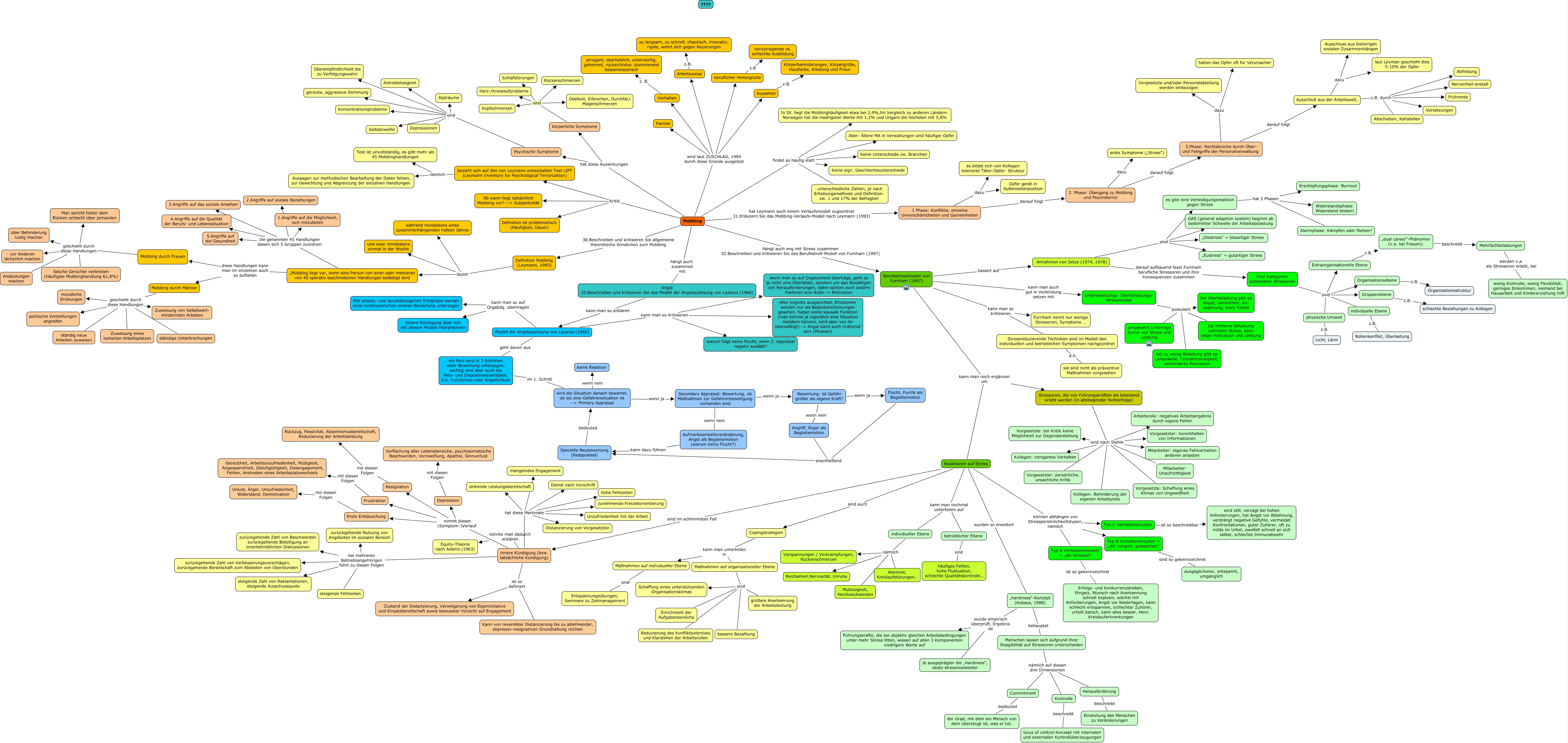 Dieses mit IHMC CmapTools erstellte CMap hat Informationen bezüglich: 10. Mobbing, Stressoren, die von Führungskräften als belastend erlebt werden (in absteigender Reihenfolge) sind nach Stehle Kollegen: intrigantes Verhalten, Körperliche Symptome sind Kopfschmerzen, Fünf Kategorien potentieller Stressoren sind physische Umwelt, Berufsstressmodell von Furnham (1997) kann man noch ergänzen um Reaktionen auf Stress, Copingstrategien kann man unterteilen in Maßnahmen auf organisationeller Ebene, innere Kündigung (bzw. tatsächliche Kündigung) bei mehreren Betriebsangehörigen führt zu diesen Folgen steigende Fehlzeiten, 3.Phase: Rechtsbrüche durch Über- und Fehlgriffe der Personalverwaltung dazu halten das Opfer oft für Verursacher, „Mobbing liegt vor, wenn eine Person von einer oder mehreren von 45 operativ beschriebenen Handlungen belästigt wird die genannten 45 Handlungen lassen sich 5 Gruppen zuordnen 3. Angriffe auf das soziale Ansehen, Verhalten z. B. arrogant, überheblich, unterwürfig, gehemmt, rücksichtslos. dominierend besserwisserisch, innere Kündigung (bzw. tatsächliche Kündigung) nimmt diesen (Symptom-)Verlauf Erste Enttäuschung, 1 Phase: Konflikte, einzelne Unverschämtheiten und Gemeinheiten darauf folgt 2. Phase: Übergang zu Mobbing und Psychoterror, innere Kündigung (bzw. tatsächliche Kündigung) nimmt diesen (Symptom-)Verlauf Depression, Mobbing hat diese Auswirkungen Körperliche Symptome, Körperliche Symptome sind Schlafstörungen, es gibt eine Verteidigungsreaktion gegen Stress hat 3 Phasen Erschöpfungsphase: Burnout, Mobbing wird laut ZUSCHLAG, 1994 durch diese Gründe ausgelöst Verhalten, innere Kündigung (bzw. tatsächliche Kündigung) ist so definiert Zustand der Distanzierung, Verweigerung von Eigeninitiative und Einsatzbereitschaft sowie bewusster Verzicht auf Engagement, Angst 33.Beschreiben und kritisieren Sie das Modell der Angstauslösung von Lazarus (1966) kann man so erklären Modell der Angstauslösung von Lazarus (1966), Mobbing durch Frauen geschieht durch diese Handlungen vor Anderen lächerlich machen, „Mobbing liegt vor, wenn eine Person von einer oder mehreren von 45 operativ beschriebenen Handlungen belästigt wird die genannten 45 Handlungen lassen sich 5 Gruppen zuordnen 4. Angriffe auf die Qualität der Berufs- und Lebenssituation