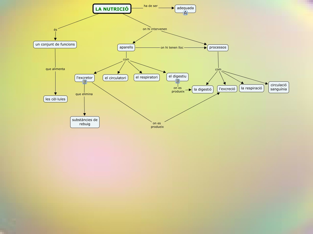 Aquest mapa conceptual conté informació relacionada amb: La nutrició, processos com la respiració, aparells on hi tenen lloc processos, processos com la digestió, LA NUTRICIÓ on hi intervenen aparells, processos com circulació sanguínia, LA NUTRICIÓ és un conjunt de funcions, aparells com l'excretor, un conjunt de funcions que alimenta les cèl·lules, l'excretor on es produeix l'excreció, aparells com el respiratori, l'excretor que elimina substàncies de rebuig, LA NUTRICIÓ on hi intervenen processos, aparells com el digestiu, LA NUTRICIÓ ha de ser adequada, el digestiu on es produeix la digestió, aparells com el circulatori, processos com l'excreció