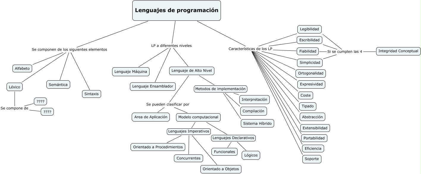 Este Cmap, tiene información relacionada con: Tema 1 LP, Fiabilidad Características de los LP Eficiencia, Simplicidad Características de los LP Coste, Simplicidad Características de los LP Eficiencia, Simplicidad Características de los LP Soporte, Modelo computacional Lenguajes Imperativos Orientado a Procedimientos, Lenguaje de Alto Nivel Metodos de implementación Sistema Híbrido, Legibilidad Características de los LP Expresividad, Fiabilidad Características de los LP Tipado, Lenguajes de programación Características de los LP Abstracción, Lenguajes de programación Se componen de los siguientes elementos Alfabeto, Legibilidad Características de los LP Portabilidad, Simplicidad Características de los LP Ortogonalidad, Fiabilidad Características de los LP Abstracción, Simplicidad Características de los LP Abstracción, Lenguajes de programación LP a diferentes niveles Lenguaje Máquina, Legibilidad Características de los LP Ortogonalidad, Lenguajes de programación Características de los LP Soporte, Lenguajes de programación Características de los LP Ortogonalidad, Legibilidad Características de los LP Eficiencia, Lenguajes de programación Características de los LP Eficiencia