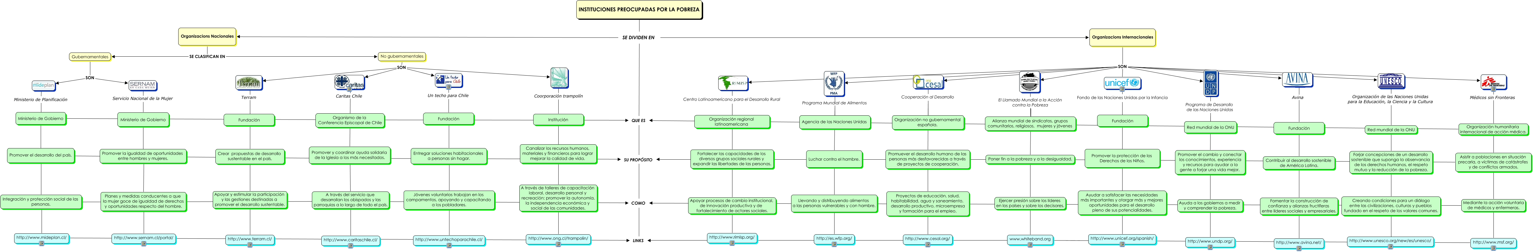 Este Cmap, tiene información relacionada con: instituciones OPP, Institución ???? Canalizar los recursos humanos, materiales y financieros para lograr mejorar la calidad de vida., Promover y coordinar ayuda solidaria de la Iglesia a los más necesitados. A través del servicio que desarrollan los obispados y las parroquias a lo largo de todo el país. http://www.caritaschile.cl/, Promover el desarrollo del país. ???? Integración y protección social de las personas., INSTITUCIONES PREOCUPADAS POR LA POBREZA SE DIVIDEN EN QUE ES, Ministerio de Gobierno ???? Promover la igualdad de oportunidades entre hombres y mujeres., Luchar contra el hambre. Llevando y distribuyendo alimentos a las personas vulnerables y con hambre. http://es.wfp.org/, Promover la protección de los Derechos de los Niños. ???? Ayudar a satisfacer las necesidades más importantes y otorgar más y mejores oportunidades para el desarrollo pleno de sus potencialidades., Organizacions Internacionales SON, Fundación ???? Entregar soluciones habitacionales a personas sin hogar., Integración y protección social de las personas. ???? COMO, Organizacions Nacionales SE CLASIFICAN EN Gubernamentales, Entregar soluciones habitacionales a personas sin hogar. ???? Jóvenes voluntarios trabajan en los campamentos, apoyando y capacitando a los pobladores., Organización humanitaria internacional de acción médica. QUE ES, Ministerio de Gobierno ???? QUE ES, ???? Fundación, Canalizar los recursos humanos, materiales y financieros para lograr mejorar la calidad de vida. A través de talleres de capacitación laboral, desarrollo personal y recreación; promover la autonomía, la independencia económica y social de las comunidades. http://www.ong.cl/trampolin/, http://www.msf.org/ ???? LINKS, ???? Ministerio de Gobierno, Organización no gubernamental española. Cooperación al Desarrollo Promuever el desarrollo humano de las personas más desfavorecidas a través de proyectos de cooperación., ???? Red mundial de la ONU
