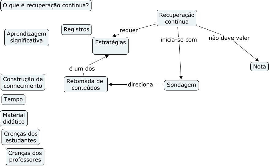 Esse mapa conceitual, produzido no IHMC CmapTools, tem a informação relacionada a: RC, Retomada de conteúdos é um dos Estratégias, Sondagem direciona Retomada de conteúdos, Recuperação contínua inicia-se com Sondagem, Recuperação contínua não deve valer Nota, Recuperação contínua requer Estratégias