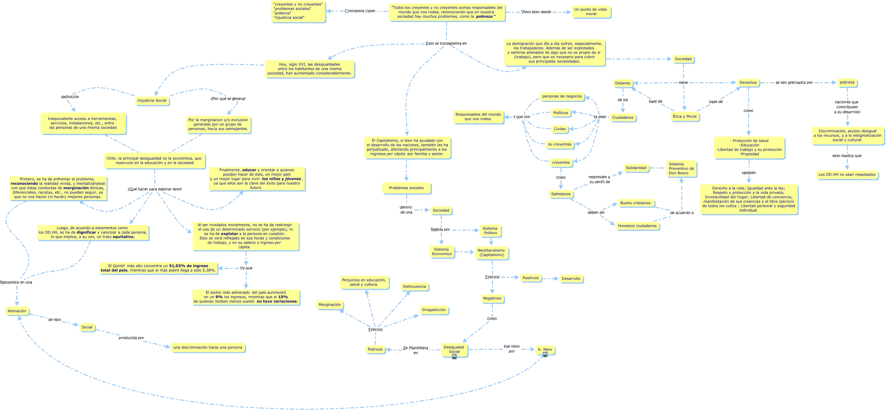 Este Cmap, tiene información relacionada con: CMAP COLABORATIVO DEL GRUPO!!, Hoy, siglo XXI, las desigualdades entre los habitantes de una misma sociedad, han aumentado considerablemente. ???? Injusticia Social, Sociedad tiene Ética y Moral, "Todos los creyentes y no creyentes somos responsables del mundo que nos rodea, reconociendo que en nuestra sociedad hay muchos problemas, como la pobreza" Visto esto desde Un punto de vista moral, Injusticia Social ¿Por qué se genera? Por la marginacion y/o exclusion generado por un grupo de personas, hacia sus semejantes., Salesianos deben ser Honestos ciudadanos, "Todos los creyentes y no creyentes somos responsables del mundo que nos rodea, reconociendo que en nuestra sociedad hay muchos problemas, como la pobreza" Esto se fundamenta en Hoy, siglo XXI, las desigualdades entre los habitantes de una misma sociedad, han aumentado considerablemente., Salesianos deben ser Bueno cristianos, Pobreza Efectos Delincuencia, Desigualad Social fue visto por K. Marx, El Capitalismo, si bien ha ayudado con el desarrollo de las naciones, también las ha perjudicado, afectando principalmente a los ingresos per cápita por familia y sector. ???? Problemas sociales, Al ser nivelados moralmente, no se ha de restringir el uso de un determinado servicio (por ejemplo), ni se ha de explotar a la persona en cuestión. Esto se verá reflejado en sus horas y condiciones de trabajo, y en su salario o ingreso per cápita. Ya que El Quintil más alto concentra un 51,03% de ingreso total del país, mientras que el más pobre llega a sólo 5,38%., Sociedad Regida por Sistema Economico, Desigualad Social Se Manifiesta en Pobreza, Ética y Moral base de Deberes, Deberes de los Ciudadanos, creyentes y que son Responsables del mundo que nos rodea., Pobreza Efectos Perjuicios en educación, salud y cultura., Inequivalente acceso a herramientas, servicios, instalaciones, etc., entre las personas de una misma sociedad ???? Chile: la principal desigualdad es la económica, que repercute en la educación y en la sociedad, Ciudadanos ya sean Políticos, Neoliberalismo (Capitalismo) Efectos Positivos