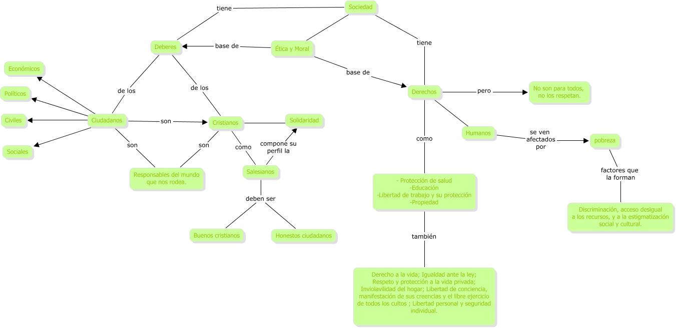 Este Cmap, tiene información relacionada con: Derechos y deberes, Ciudadanos son Responsables del mundo que nos rodea., Ciudadanos son Cristianos, Ciudadanos ???? Sociales, Ciudadanos ???? Políticos, Ética y Moral base de Deberes, pobreza factores que la forman Discriminación, acceso desigual a los recursos, y a la estigmatización social y cultural., Deberes de los Cristianos, Salesianos compone su perfil la Solidaridad, - Protección de salud -Educación -Libertad de trabajo y su protección -Propiedad también Derecho a la vida; Igualdad ante la ley; Respeto y protección a la vida privada; Inviolavilidad del hogar; Libertad de conciencia, manifestación de sus creencias y el libre ejercicio de todos los cultos ; Libertad personal y seguridad individual., Ciudadanos ???? Económicos, Ciudadanos ???? Civiles, Derechos ???? Humanos, Derechos como - Protección de salud -Educación -Libertad de trabajo y su protección -Propiedad, Ética y Moral base de Derechos, Cristianos ???? Solidaridad, Sociedad tiene Derechos, Sociedad ???? Ética y Moral, Salesianos deben ser Buenos cristianos, Cristianos son Responsables del mundo que nos rodea., Sociedad tiene Deberes