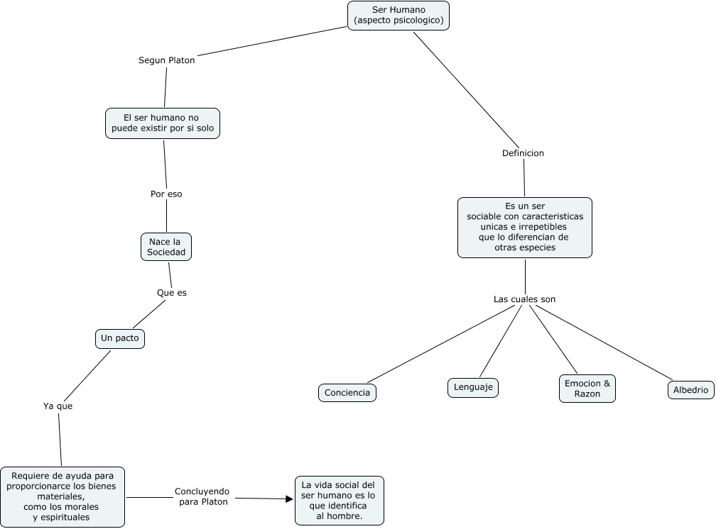 Este Cmap, tiene información relacionada con: dimensión filosofica, Requiere de ayuda para proporcionarce los bienes materiales, como los morales y espirituales Concluyendo para Platon La vida social del ser humano es lo que identifica al hombre., Ser Humano (aspecto psicologico) Definicion Es un ser sociable con caracteristicas unicas e irrepetibles que lo diferencian de otras especies, Es un ser sociable con caracteristicas unicas e irrepetibles que lo diferencian de otras especies Las cuales son Emocion & Razon, Es un ser sociable con caracteristicas unicas e irrepetibles que lo diferencian de otras especies Las cuales son Lenguaje, El ser humano no puede existir por si solo Por eso Nace la Sociedad, Es un ser sociable con caracteristicas unicas e irrepetibles que lo diferencian de otras especies Las cuales son Conciencia, Un pacto Ya que Requiere de ayuda para proporcionarce los bienes materiales, como los morales y espirituales, Nace la Sociedad Que es Un pacto, Ser Humano (aspecto psicologico) Segun Platon El ser humano no puede existir por si solo, Es un ser sociable con caracteristicas unicas e irrepetibles que lo diferencian de otras especies Las cuales son Albedrio