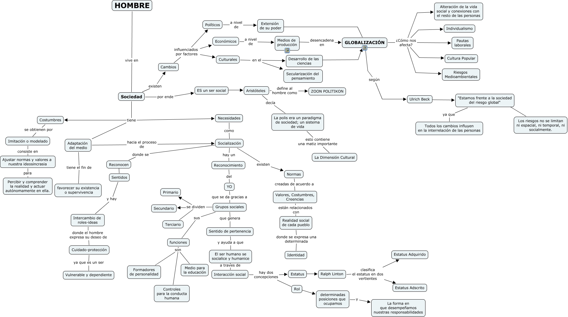 Este Cmap, tiene información relacionada con: Social, Grupos sociales se dividen Primario, Necesidades como Socialización, Cambios influenciados por factores Culturales, Cuidado-protección ya que es un ser Vulnerable y dependiente, GLOBALIZACIÓN ¿Cómo nos afecta? Cultura Popular, La polis era un paradigma de sociedad; un sistema de vida esto contiene una matiz importante La Dimensión Cultural, Aristóteles decía La polis era un paradigma de sociedad; un sistema de vida, Culturales en el Secularización del pensamiento, ES un ser social ???? Aristóteles, GLOBALIZACIÓN ¿Cómo nos afecta? Individualismo, Grupos sociales se dividen Terciario, Intercambio de roles-ideas donde el hombre expresa su deseo de Cuidado-protección, funciones son Controles para la conducta humana, Adaptación del medio hacia el proceso de Socialización, Sociedad tiene Necesidades, Políticos a nivel de Extensión de su poder, determinadas posiciones que ocupamos y La forma en que desempeñamos nuestras responsabilidades, Extensión de su poder ???? GLOBALIZACIÓN, Grupos sociales se dividen Secundario, Normas creadas de acuerdo a Valores, Costumbres, Creencias