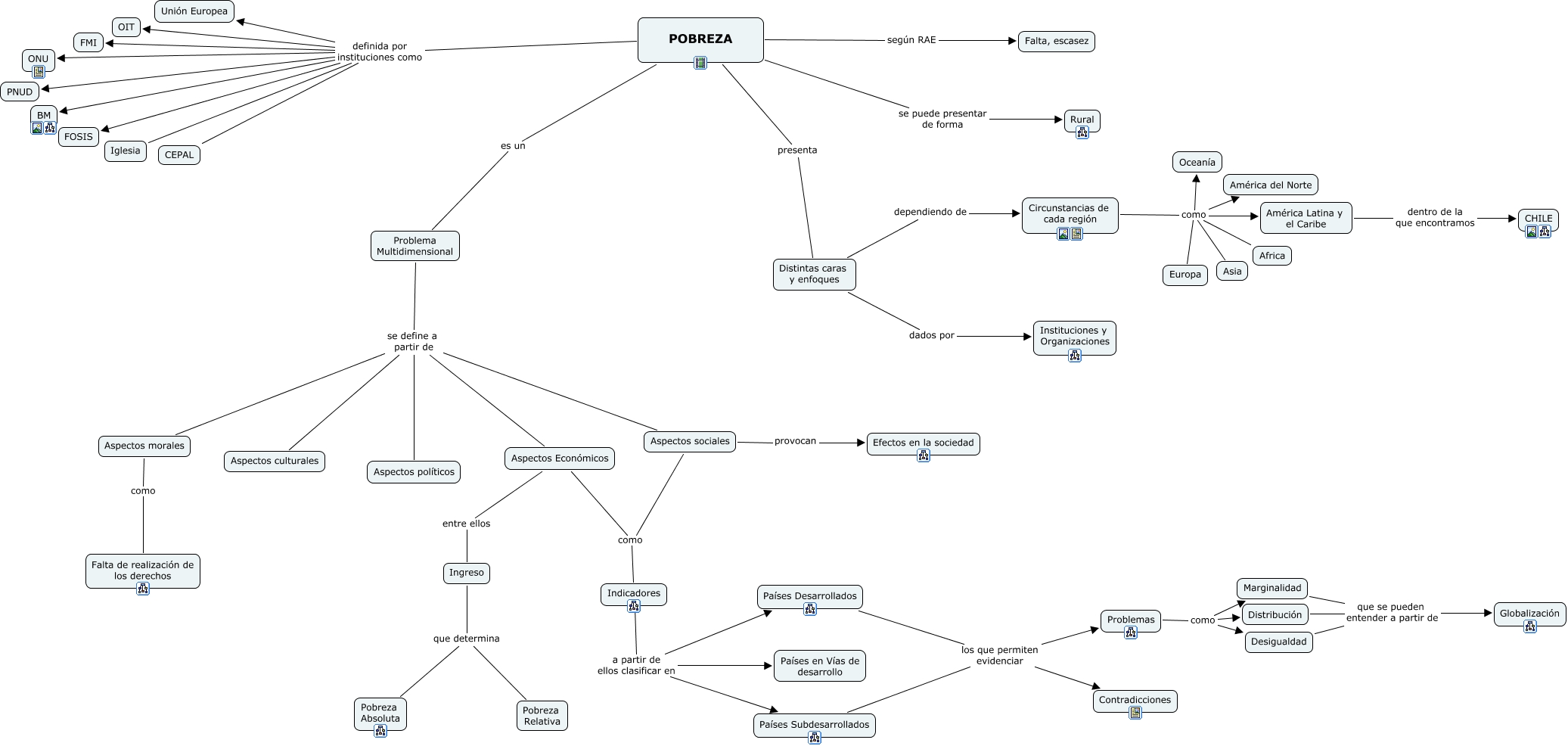 Este Cmap, tiene información relacionada con: Sin Título, Circunstancias de cada región como Asia, POBREZA según RAE Falta, escasez, Circunstancias de cada región como Europa, POBREZA definida por instituciones como PNUD, Desigualdad que se pueden entender a partir de Globalización, POBREZA definida por instituciones como CEPAL, Marginalidad que se pueden entender a partir de Globalización, POBREZA definida por instituciones como BM, América Latina y el Caribe dentro de la que encontramos CHILE, Aspectos morales como Falta de realización de los derechos, Ingreso que determina Pobreza Relativa, Problemas como Desigualdad, POBREZA definida por instituciones como FMI, Aspectos Económicos entre ellos Ingreso, Distintas caras y enfoques dados por Instituciones y Organizaciones, Problemas como Distribución, POBREZA presenta Distintas caras y enfoques, Problema Multidimensional se define a partir de Aspectos culturales, Problemas como Marginalidad, Distribución que se pueden entender a partir de Globalización