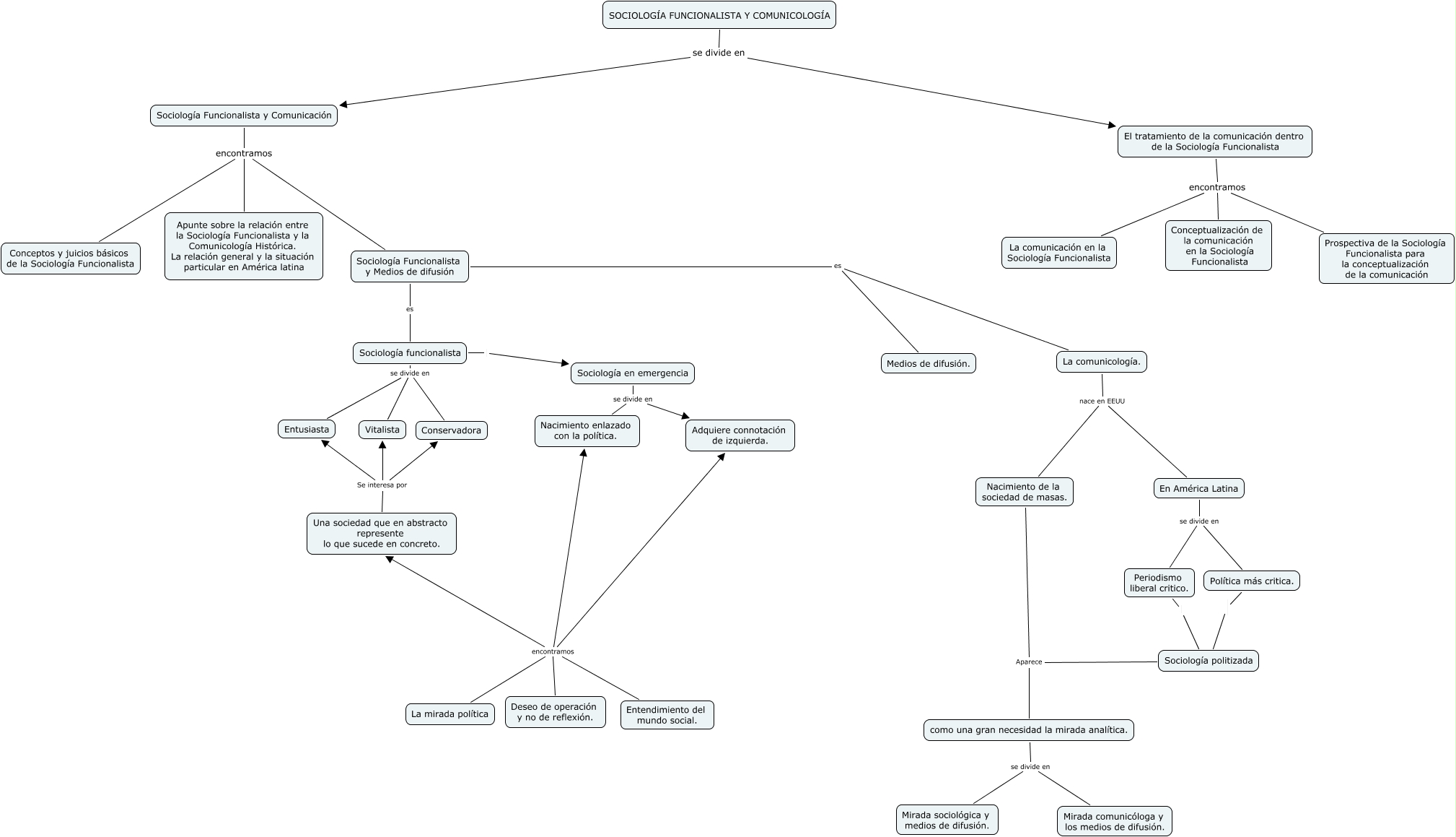 Este Cmap, tiene información relacionada con: Teoria, La comunicología. nace en EEUU Nacimiento de la sociedad de masas., Sociología funcionalista se divide en Entusiasta, En América Latina se divide en Política más critica., Deseo de operación y no de reflexión. encontramos Adquiere connotación de izquierda., El tratamiento de la comunicación dentro de la Sociología Funcionalista encontramos La comunicación en la Sociología Funcionalista, Política más critica. Sociología politizada, Deseo de operación y no de reflexión. encontramos La mirada política, Deseo de operación y no de reflexión. encontramos Una sociedad que en abstracto represente lo que sucede en concreto., Una sociedad que en abstracto represente lo que sucede en concreto. Se interesa por Entusiasta, Sociología Funcionalista y Comunicación encontramos Conceptos y juicios básicos de la Sociología Funcionalista, SOCIOLOGÍA FUNCIONALISTA Y COMUNICOLOGÍA se divide en Sociología Funcionalista y Comunicación, Sociología Funcionalista y Comunicación encontramos Apunte sobre la relación entre la Sociología Funcionalista y la Comunicología Histórica. La relación general y la situación particular en América latina, Una sociedad que en abstracto represente lo que sucede en concreto. Se interesa por Vitalista, Sociología en emergencia se divide en Adquiere connotación de izquierda., El tratamiento de la comunicación dentro de la Sociología Funcionalista encontramos Prospectiva de la Sociología Funcionalista para la conceptualización de la comunicación, Periodismo liberal critico. Sociología politizada, Sociología Funcionalista y Medios de difusión es La comunicología., SOCIOLOGÍA FUNCIONALISTA Y COMUNICOLOGÍA se divide en El tratamiento de la comunicación dentro de la Sociología Funcionalista, Sociología Funcionalista y Medios de difusión es Sociología funcionalista, Sociología funcionalista se divide en Vitalista
