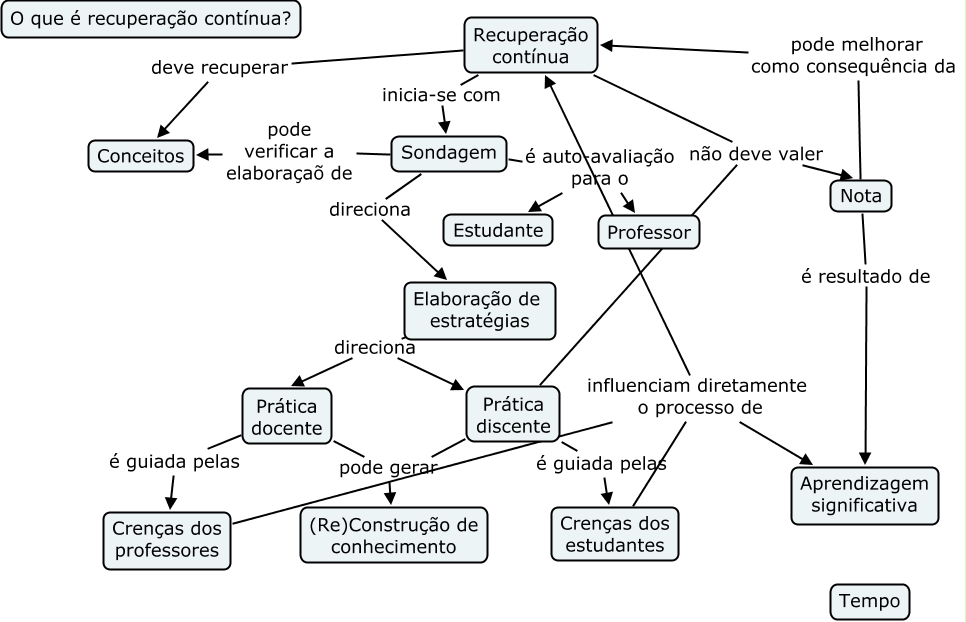 Esse mapa conceitual, produzido no IHMC CmapTools, tem a informação relacionada a: RCBIOCIEN, Prática discente pode gerar (Re)Construção de conhecimento, Elaboração de estratégias direciona Prática discente, Prática docente é guiada pelas Crenças dos professores, Recuperação contínua deve recuperar Conceitos, Nota pode melhorar como consequência da Recuperação contínua, Crenças dos professores influenciam diretamente o processo de Aprendizagem significativa, Crenças dos estudantes influenciam diretamente o processo de Aprendizagem significativa, Nota é resultado de Aprendizagem significativa, Sondagem é auto-avaliação para o Professor, Crenças dos estudantes influenciam diretamente o processo de Recuperação contínua, Sondagem pode verificar a elaboraçaõ de Conceitos, Sondagem é auto-avaliação para o Estudante, Prática docente pode gerar (Re)Construção de conhecimento, Recuperação contínua não deve valer Nota, Prática discente é guiada pelas Crenças dos estudantes, Prática discente não deve valer Nota, Elaboração de estratégias direciona Prática docente, Crenças dos professores influenciam diretamente o processo de Recuperação contínua, Sondagem direciona Elaboração de estratégias, Recuperação contínua inicia-se com Sondagem