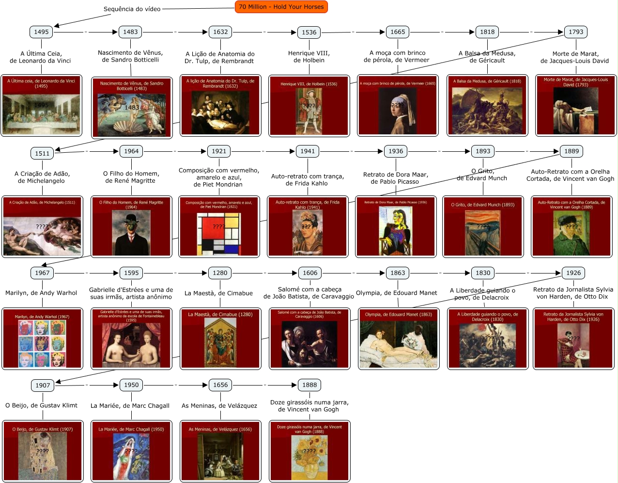 Esse mapa conceitual, produzido no IHMC CmapTools, tem a informação relacionada a: 70milhoes, 1495 . 1483, 1656 As Meninas, de Velázquez ????, 1483 Nascimento de Vênus, de Sandro Botticelli 1483, 1280 . 1606, 1511 A Criação de Adão, de Michelangelo ????, 1280 La Maestà, de Cimabue ????, 1921 Composição com vermelho, amarelo e azul, de Piet Mondrian ????, 1632 . 1536, 1941 Auto-retrato com trança, de Frida Kahlo ????, 1964 . 1921, 70 Million - Hold Your Horses Sequência do vídeo 1495, 1818 A Balsa da Medusa, de Géricault ????, 1793 ???? 1511, 1950 . 1656, 1893 O Grito, de Edvard Munch ????, 1483 . 1632, 1536 . 1665, 1830 A Liberdade guiando o povo, de Delacroix ????, 1830 . 1926, 1888 Doze girassóis numa jarra, de Vincent van Gogh ????