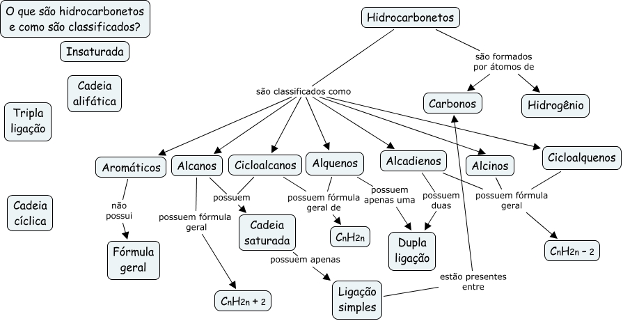 Esse mapa conceitual, produzido no IHMC CmapTools, tem a informação relacionada a: Hidrocarbonetos 2ºC, Hidrocarbonetos são classificados como Alcadienos, Hidrocarbonetos são formados por átomos de Carbonos, Cicloalcanos possuem Cadeia saturada, Aromáticos não possui Fórmula geral, Alquenos possuem fórmula geral de CnH2n, Cicloalquenos possuem fórmula geral CnH2n - 2, Hidrocarbonetos são formados por átomos de Hidrogênio, Hidrocarbonetos são classificados como Aromáticos, Cicloalcanos possuem fórmula geral de CnH2n, Alcadienos possuem duas Dupla ligação, Hidrocarbonetos são classificados como Alcinos, Cadeia saturada possuem apenas Ligação simples, Alcanos possuem Cadeia saturada, Alquenos possuem apenas uma Dupla ligação, Hidrocarbonetos são classificados como Alcanos, Ligação simples estão presentes entre Carbonos, Alcinos possuem fórmula geral CnH2n - 2, Hidrocarbonetos são classificados como Alquenos, Alcadienos possuem fórmula geral CnH2n - 2, Alcanos possuem fórmula geral CnH2n + 2