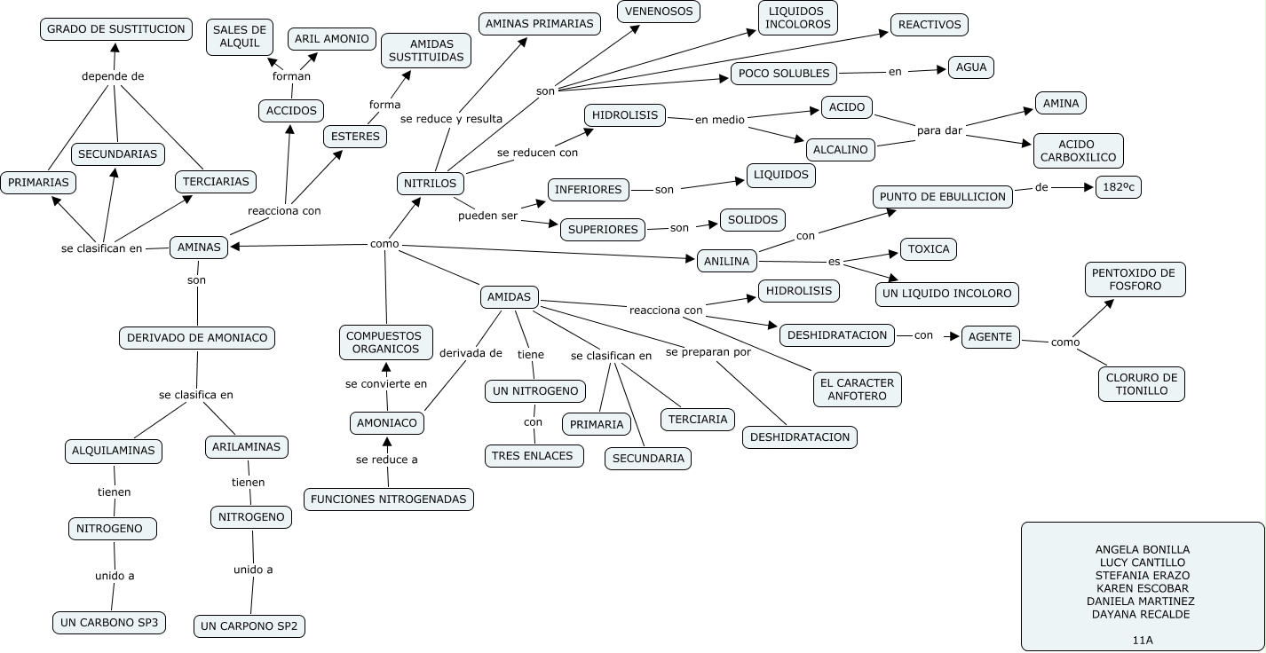 Este Cmap, tiene información relacionada con: FUNCIONES NITROGENADAS 4º PERIIODO, TERCIARIAS depende de GRADO DE SUSTITUCION, ANILINA es TOXICA, AMINAS reacciona con ESTERES, DESHIDRATACION con AGENTE, ACCIDOS forman SALES DE ALQUIL, AMIDAS reacciona con HIDROLISIS, ALQUILAMINAS tienen NITROGENO, ANILINA con PUNTO DE EBULLICION, COMPUESTOS ORGANICOS como AMIDAS, AMIDAS reacciona con DESHIDRATACION, UN NITROGENO con TRES ENLACES, COMPUESTOS ORGANICOS como AMINAS, NITRILOS pueden ser INFERIORES, AMIDAS tiene UN NITROGENO, HIDROLISIS en medio ACIDO, NITRILOS se reduce y resulta AMINAS PRIMARIAS, NITROGENO unido a UN CARPONO SP2, ANILINA es UN LIQUIDO INCOLORO, NITRILOS son LIQUIDOS INCOLOROS, AMIDAS se clasifican en PRIMARIA