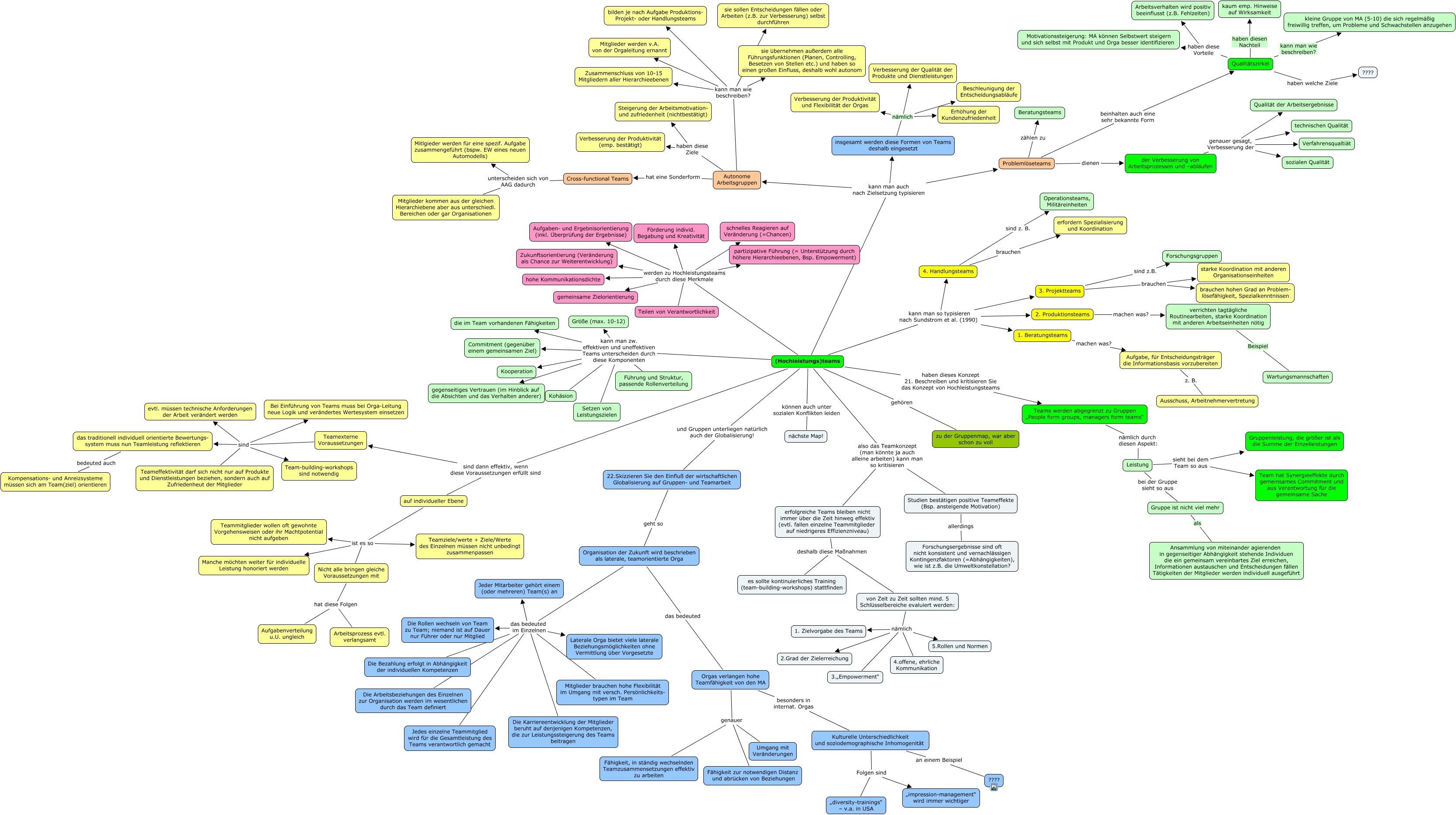 Dieses mit IHMC CmapTools erstellte CMap hat Informationen bezüglich: 7.1 Teams, Organisation der Zukunft wird beschrieben als laterale, teamorientierte Orga das bedeuted im Einzelnen Jeder Mitarbeiter gehört einem (oder mehreren) Team(s) an, 3. Projektteams sind z.B. Forschungsgruppen, insgesamt werden diese Formen von Teams deshalb eingesetzt nämlich Erhöhung der Kundenzufriedenheit, Qualitätszirkel haben diese Vorteile Arbeitsverhalten wird positiv beeinflusst (z.B. Fehlzeiten), (Hochleistungs)teams kann man auch nach Zielsetzung typisieren insgesamt werden diese Formen von Teams deshalb eingesetzt, Organisation der Zukunft wird beschrieben als laterale, teamorientierte Orga das bedeuted im Einzelnen Jedes einzelne Teammitglied wird für die Gesamtleistung des Teams verantwortlich gemacht, Teamexterne Voraussetzungen sind Bei Einführung von Teams muss bei Orga-Leitung neue Logik und verändertes Wertesystem einsetzen, (Hochleistungs)teams also das Teamkonzept (man könnte ja auch alleine arbeiten) kann man so kritisieren erfolgreiche Teams bleiben nicht immer über die Zeit hinweg effektiv (evtl. fallen einzelne Teammitglieder auf niedrigeres Effizienzniveau), Orgas verlangen hohe Teamfähigkeit von den MA genauer Fähigkeit zur notwendigen Distanz und abrücken von Beziehungen, (Hochleistungs)teams werden zu Hochleistungsteams durch diese Merkmale hohe Kommunikationsdichte, Orgas verlangen hohe Teamfähigkeit von den MA genauer Fähigkeit, in ständig wechselnden Teamzusammensetzungen effektiv zu arbeiten, (Hochleistungs)teams werden zu Hochleistungsteams durch diese Merkmale partizipative Führung (= Unterstützung durch höhere Hierarchieebenen, Bsp. Empowerment), Qualitätszirkel haben diesen Nachteil kaum emp. Hinweise auf Wirksamkeit, Problemlöseteams beinhalten auch eine sehr bekannte Form Qualitätszirkel, der Verbesserung von Arbeitsprozessen und –abläufen genauer gesagt, Verbesserung der sozialen Qualität, (Hochleistungs)teams kann man zw. effektiven und uneffektiven Teams unterscheiden durch diese Komponenten Kooperation, Aufgabe, für Entscheidungsträger die Informationsbasis vorzubereiten z. B. Ausschuss, Arbeitnehmervertretung, Autonome Arbeitsgruppen kann man wie beschreiben? Zusammenschluss von 10-15 Mitgliedern aller Hierarchieebenen, auf individueller Ebene ist es so Manche möchten weiter für individuelle Leistung honoriert werden, Cross-functional Teams unterscheiden sich von AAG dadurch Mitglieder kommen aus der gleichen Hierarchiebene aber aus unterschiedl. Bereichen oder gar Organisationen