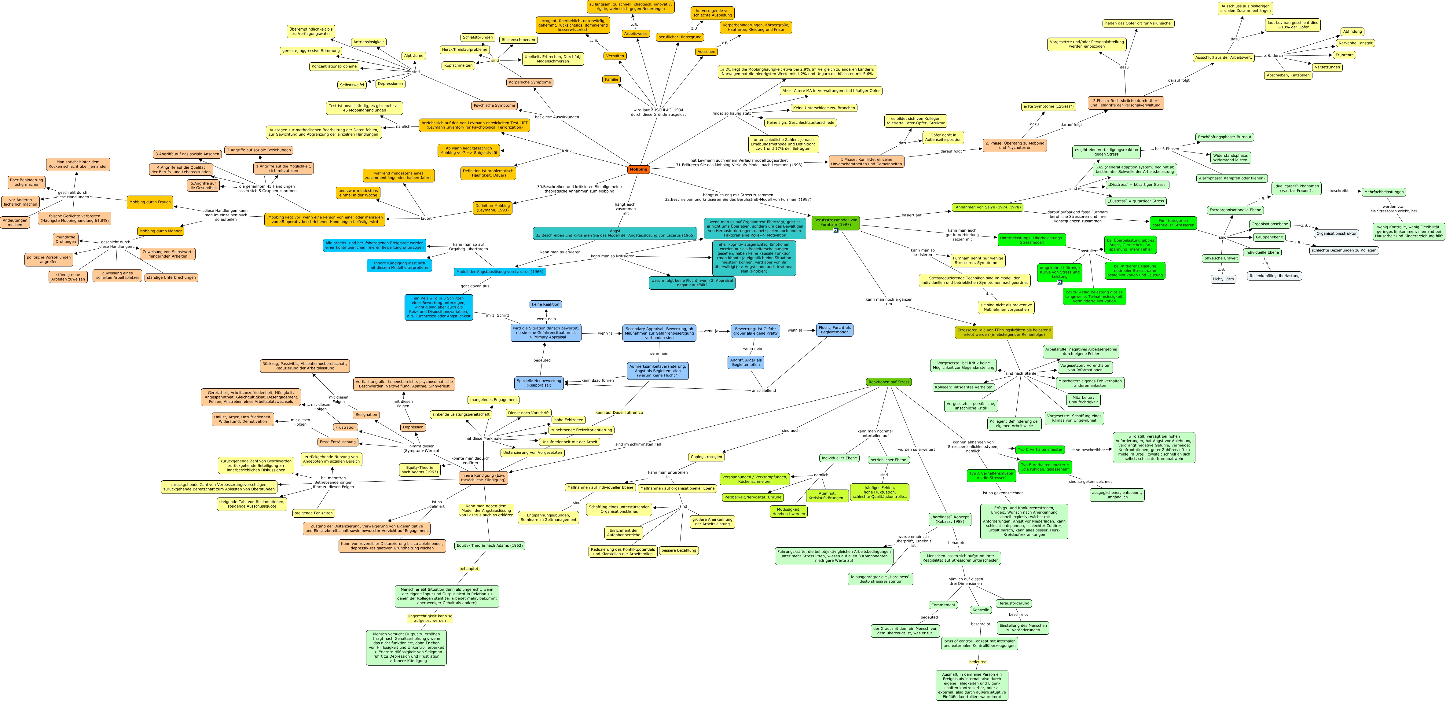 Dieses mit IHMC CmapTools erstellte CMap hat Informationen bezüglich: 10. Mobbing, Stressoren, die von Führungskräften als belastend erlebt werden (in absteigender Reihenfolge) sind nach Stehle Kollegen: intrigantes Verhalten, Körperliche Symptome sind Kopfschmerzen, Fünf Kategorien potentieller Stressoren sind physische Umwelt, Berufsstressmodell von Furnham (1997) kann man noch ergänzen um Reaktionen auf Stress, Copingstrategien kann man unterteilen in Maßnahmen auf organisationeller Ebene, innere Kündigung (bzw. tatsächliche Kündigung) bei mehreren Betriebsangehörigen führt zu diesen Folgen steigende Fehlzeiten, locus of control-Konzept mit internalen und externalen Kontrollüberzeugungen bedeuted Ausmaß, in dem eine Person ein Ereignis als internal, also durch eigene Fähigkeiten und Eigen- schaften kontrollierbar, oder als external, also durch äußere situative Einflüße konrtolliert wahrnimmt, 3.Phase: Rechtsbrüche durch Über- und Fehlgriffe der Personalverwaltung dazu halten das Opfer oft für Verursacher, „Mobbing liegt vor, wenn eine Person von einer oder mehreren von 45 operativ beschriebenen Handlungen belästigt wird die genannten 45 Handlungen lassen sich 5 Gruppen zuordnen 3. Angriffe auf das soziale Ansehen, Verhalten z. B. arrogant, überheblich, unterwürfig, gehemmt, rücksichtslos. dominierend besserwisserisch, innere Kündigung (bzw. tatsächliche Kündigung) nimmt diesen (Symptom-)Verlauf Erste Enttäuschung, 1 Phase: Konflikte, einzelne Unverschämtheiten und Gemeinheiten darauf folgt 2. Phase: Übergang zu Mobbing und Psychoterror, innere Kündigung (bzw. tatsächliche Kündigung) nimmt diesen (Symptom-)Verlauf Depression, Mobbing hat diese Auswirkungen Körperliche Symptome, Körperliche Symptome sind Schlafstörungen, es gibt eine Verteidigungsreaktion gegen Stress hat 3 Phasen Erschöpfungsphase: Burnout, Mobbing wird laut ZUSCHLAG, 1994 durch diese Gründe ausgelöst Verhalten, innere Kündigung (bzw. tatsächliche Kündigung) ist so definiert Zustand der Distanzierung, Verweigerung von Eigeninitiative und Einsatzbereitschaft sowie bewusster Verzicht auf Engagement, Angst 33.Beschreiben und kritisieren Sie das Modell der Angstauslösung von Lazarus (1966) kann man so erklären Modell der Angstauslösung von Lazarus (1966), Mobbing durch Frauen geschieht durch diese Handlungen vor Anderen lächerlich machen