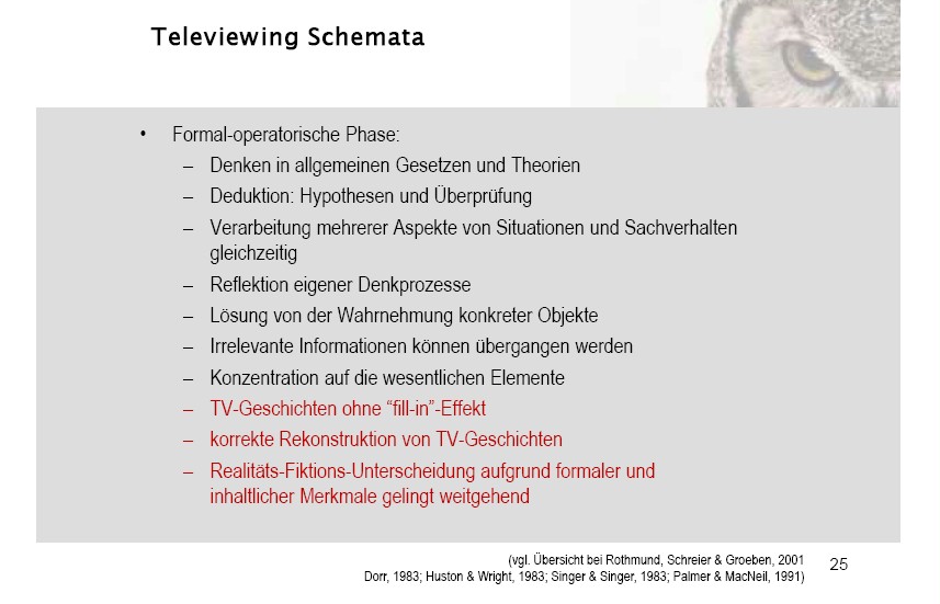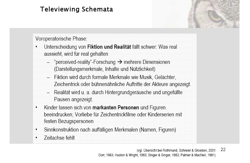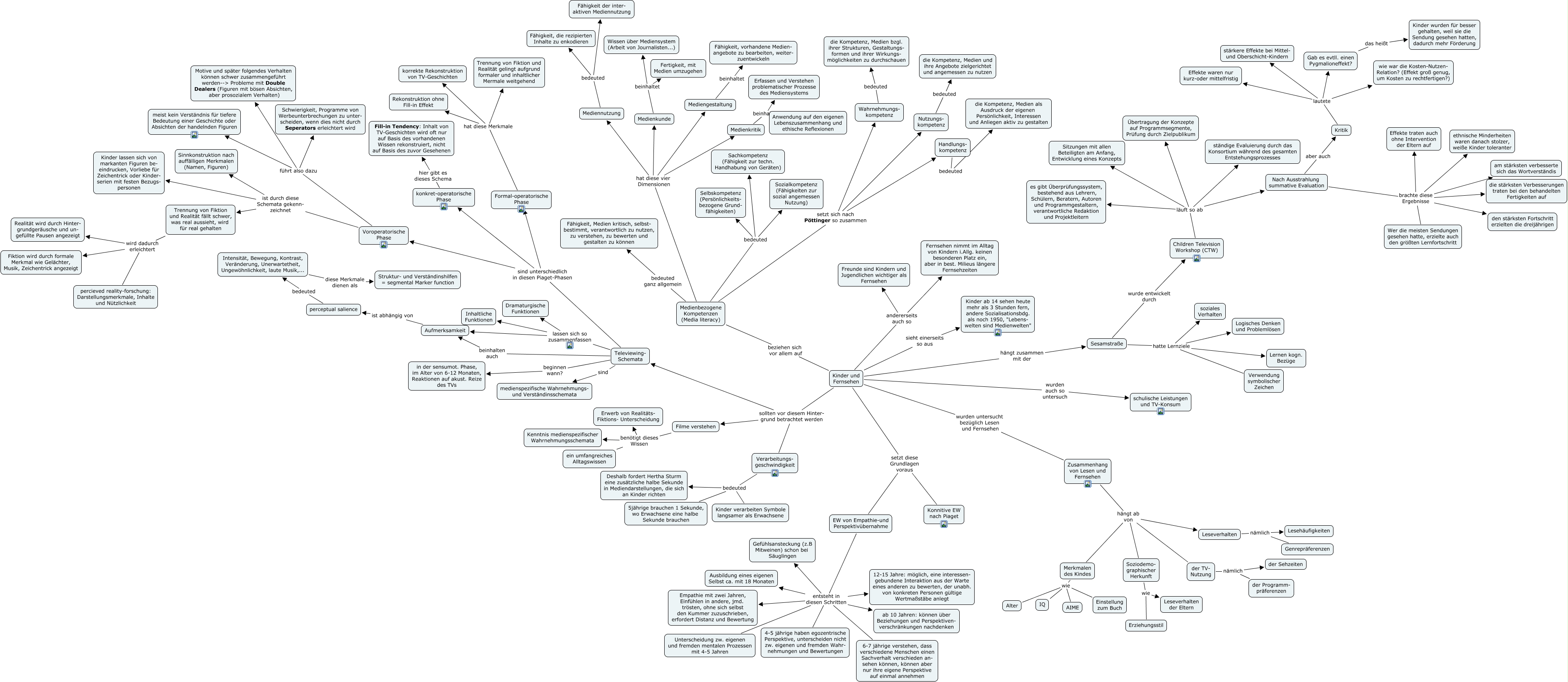 Dieses mit IHMC CmapTools erstellte CMap hat Informationen bezüglich: 9.Medienkompetenz, Televiewing- Schemata sind unterschiedlich in diesen Piaget-Phasen konkret-operatorische Phase, Kinder und Fernsehen wurden untersucht bezüglich Lesen und Fernsehen Zusammenhang von Lesen und Fernsehen, Soziodemo- graphischer Herkunft wie Erziehungsstil, Voroperatorische Phase führt also dazu meist kein Verständnis für tiefere Bedeutung einer Geschichte oder Absichten der handelnden Figuren, EW von Empathie-und Perspektivübernahme entsteht in diesen Schritten 12-15 Jahre: möglich, eine interessen- gebundene Interaktion aus der Warte eines anderen zu bewerten, der unabh. von konkreten Personen gültige Wertmaßstäbe anlegt, Medienbezogene Kompetenzen (Media literacy) beziehen sich vor allem auf Kinder und Fernsehen, EW von Empathie-und Perspektivübernahme entsteht in diesen Schritten ab 10 Jahren: können über Beziehungen und Perspektiven- verschränkungen nachdenken, Handlungs- kompetenz bedeuted die Kompetenz, Medien als Ausdruck der eigenen Persönlichkeit, Interessen und Anliegen aktiv zu gestalten, EW von Empathie-und Perspektivübernahme entsteht in diesen Schritten 4-5 jährige haben egozentrische Perspektive, unterscheiden nicht zw. eigenen und fremden Wahr- nehmungen und Bewertungen, Televiewing- Schemata lassen sich so zusammenfassen Inhaltliche Funktionen, Medienbezogene Kompetenzen (Media literacy) hat diese vier Dimensionen Medienkunde, Nach Ausstrahlung summative Evaluation brachte diese Ergebnisse ethnische Minderheiten waren danach stolzer, weiße Kinder toleranter, Verarbeitungs- geschwindigkeit bedeuted Deshalb fordert Hertha Sturm eine zusätzliche halbe Sekunde in Mediendarstellungen, die sich an Kinder richten, Nach Ausstrahlung summative Evaluation brachte diese Ergebnisse Wer die meisten Sendungen gesehen hatte, erzielte auch den größten Lernfortschritt, Kritik lautete wie war die Kosten-Nutzen- Relation? (Effekt groß genug, um Kosten zu rechtfertigen?), Kinder und Fernsehen hängt zusammen mit der Sesamstraße, konkret-operatorische Phase hier gibt es dieses Schema Fill-in Tendency: Inhalt von TV-Geschichten wird oft nur auf Basis des vorhandenen Wissen rekonstruiert, nicht auf Basis des zuvor Gesehenen, Kinder und Fernsehen sollten vor diesem Hinter- grund betrachtet werden Televiewing- Schemata, Intensität, Bewegung, Kontrast, Veränderung, Unerwartetheit, Ungewöhnlichkeit, laute Musik,... diese Merkmale dienen als Struktur- und Verständinshilfen = segmental Marker function, Medienbezogene Kompetenzen (Media literacy) bedeuted Sachkompetenz (Fähigkeit zur techn. Handhabung von Geräten)