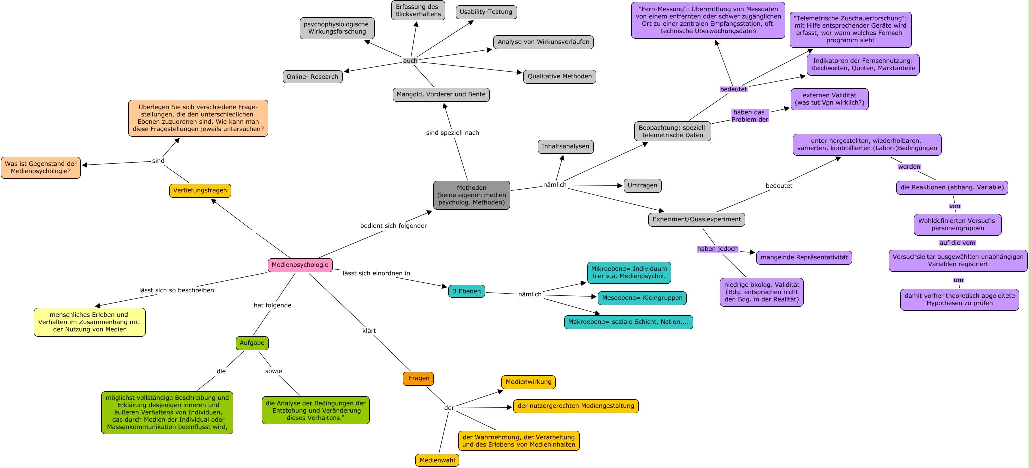 Dieses mit IHMC CmapTools erstellte CMap hat Informationen bezüglich: 1.Definition und Aufgabe, Experiment/Quasiexperiment haben jedoch mangelnde Repräsentativität, Aufgabe die möglichst vollständige Beschreibung und Erklärung desjenigen inneren und äußeren Verhaltens von Individuen, das durch Medien der Individual oder Massenkommunikation beeinflusst wird,, Medienpsychologie lässt sich so beschreiben menschliches Erleben und Verhalten im Zusammenhang mit der Nutzung von Medien, Methoden (keine eigenen medien psycholog. Methoden) sind speziell nach Mangold, Vorderer und Bente, Vertiefungsfragen sind Was ist Gegenstand der Medienpsychologie?, 3 Ebenen nämlich Makroebene= soziale Schicht, Nation,..., Beobachtung: speziell telemetrische Daten bedeutet "Fern-Messung": Übermittlung von Messdaten von einem entfernten oder schwer zugänglichen Ort zu einer zentralen Empfangsstation, oft technische Überwachungsdaten, Fragen der Medienwahl, Fragen der Medienwirkung, Medienpsychologie bedient sich folgender Methoden (keine eigenen medien psycholog. Methoden), Wohldefinierten Versuchs- personengruppen auf die vom Versuchsleiter ausgewählten unabhängigen Variablen registriert, Aufgabe sowie die Analyse der Bedingungen der Entstehung und Veränderung dieses Verhaltens.“, unter hergestellten, wiederholbaren, variierten, kontrollierten (Labor-)Bedingungen werden die Reaktionen (abhäng. Variable), Mangold, Vorderer und Bente auch psychophysiologische Wirkungsforschung, 3 Ebenen nämlich Mikroebene= Individuum hier v.a. Medienpsychol., Mangold, Vorderer und Bente auch Erfassung des Blickverhaltens, Medienpsychologie lässt sich einordnen in 3 Ebenen, Experiment/Quasiexperiment bedeutet unter hergestellten, wiederholbaren, variierten, kontrollierten (Labor-)Bedingungen, Versuchsleiter ausgewählten unabhängigen Variablen registriert um damit vorher theoretisch abgeleitete Hypothesen zu prüfen, Methoden (keine eigenen medien psycholog. Methoden) nämlich Beobachtung: speziell telemetrische Daten