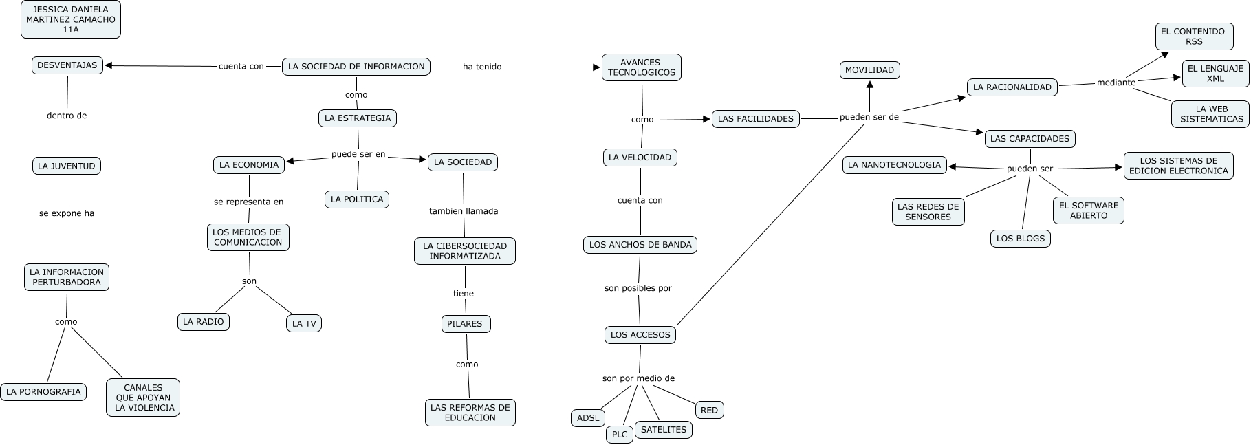 Este Cmap, tiene información relacionada con: SOCIEDAD DE LA INFORMACION JESSICA DANIELA MARTINEZ CAMACHO 11A, AVANCES TECNOLOGICOS como LAS FACILIDADES, LAS FACILIDADES pueden ser de MOVILIDAD, LA VELOCIDAD cuenta con LOS ANCHOS DE BANDA, LA SOCIEDAD DE INFORMACION como LA ESTRATEGIA, LOS ACCESOS son por medio de RED, DESVENTAJAS dentro de LA JUVENTUD, LA RACIONALIDAD mediante EL CONTENIDO RSS, LA JUVENTUD se expone ha LA INFORMACION PERTURBADORA, LAS FACILIDADES pueden ser de LOS ACCESOS, LA SOCIEDAD tambien llamada LA CIBERSOCIEDAD INFORMATIZADA, LA WEB SISTEMATICAS mediante EL LENGUAJE XML, LA WEB SISTEMATICAS mediante EL CONTENIDO RSS, LA SOCIEDAD DE INFORMACION cuenta con DESVENTAJAS, LAS CAPACIDADES pueden ser LOS SISTEMAS DE EDICION ELECTRONICA, LA INFORMACION PERTURBADORA como LA PORNOGRAFIA, LOS MEDIOS DE COMUNICACION son LA TV, LA CIBERSOCIEDAD INFORMATIZADA tiene PILARES, LA SOCIEDAD DE INFORMACION ha tenido AVANCES TECNOLOGICOS, AVANCES TECNOLOGICOS como LA VELOCIDAD, LA INFORMACION PERTURBADORA como CANALES QUE APOYAN LA VIOLENCIA