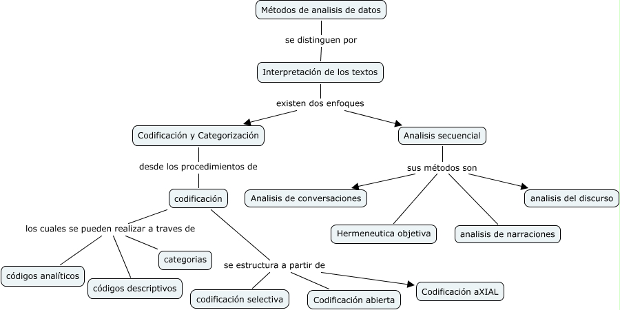 Este Cmap, tiene información relacionada con: Procedimientos de codificación, codificación se estructura a partir de codificación selectiva, codificación los cuales se pueden realizar a traves de categorias, Analisis secuencial sus métodos son analisis de narraciones, codificación los cuales se pueden realizar a traves de códigos analíticos, Métodos de analisis de datos se distinguen por Interpretación de los textos, Analisis secuencial sus métodos son Analisis de conversaciones, codificación se estructura a partir de Codificación abierta, Interpretación de los textos existen dos enfoques Codificación y Categorización, Interpretación de los textos existen dos enfoques Analisis secuencial, Analisis secuencial sus métodos son Hermeneutica objetiva, Codificación y Categorización desde los procedimientos de codificación, codificación los cuales se pueden realizar a traves de códigos descriptivos, codificación se estructura a partir de Codificación aXIAL, Analisis secuencial sus métodos son analisis del discurso