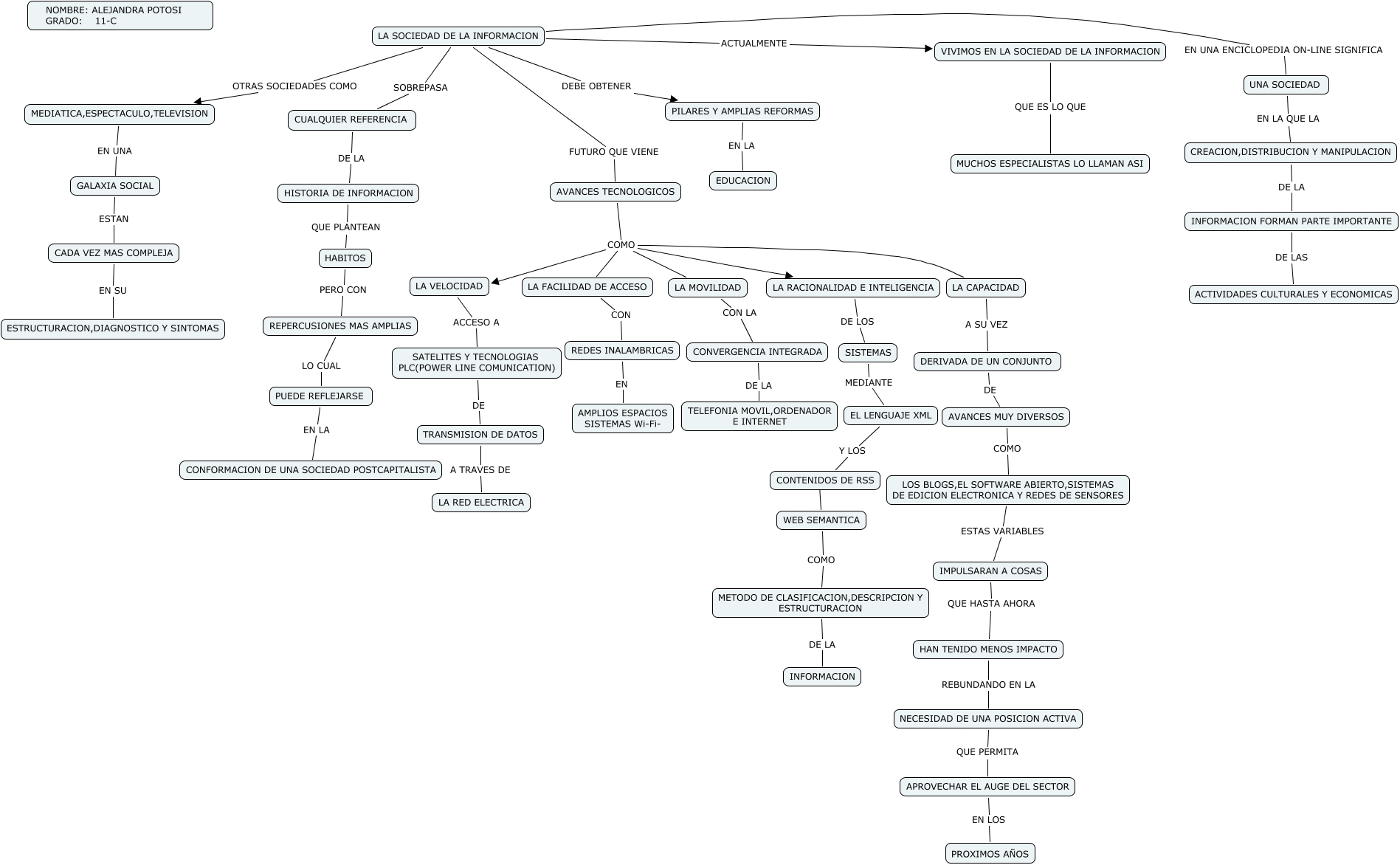 Este Cmap, tiene información relacionada con: LA SOCIEDAD DE LA INFORMACION, LA CAPACIDAD A SU VEZ DERIVADA DE UN CONJUNTO, HAN TENIDO MENOS IMPACTO REBUNDANDO EN LA NECESIDAD DE UNA POSICION ACTIVA, DERIVADA DE UN CONJUNTO DE AVANCES MUY DIVERSOS, LA RACIONALIDAD E INTELIGENCIA DE LOS SISTEMAS, INFORMACION FORMAN PARTE IMPORTANTE DE LAS ACTIVIDADES CULTURALES Y ECONOMICAS, AVANCES TECNOLOGICOS COMO LA VELOCIDAD, AVANCES TECNOLOGICOS COMO LA FACILIDAD DE ACCESO, IMPULSARAN A COSAS QUE HASTA AHORA HAN TENIDO MENOS IMPACTO, REPERCUSIONES MAS AMPLIAS LO CUAL PUEDE REFLEJARSE, PILARES Y AMPLIAS REFORMAS EN LA EDUCACION, HABITOS PERO CON REPERCUSIONES MAS AMPLIAS, UNA SOCIEDAD EN LA QUE LA CREACION,DISTRIBUCION Y MANIPULACION, MEDIATICA,ESPECTACULO,TELEVISION EN UNA GALAXIA SOCIAL, SISTEMAS MEDIANTE EL LENGUAJE XML, LA SOCIEDAD DE LA INFORMACION OTRAS SOCIEDADES COMO MEDIATICA,ESPECTACULO,TELEVISION, AVANCES TECNOLOGICOS COMO LA CAPACIDAD, HISTORIA DE INFORMACION QUE PLANTEAN HABITOS, EL LENGUAJE XML Y LOS CONTENIDOS DE RSS, LA SOCIEDAD DE LA INFORMACION DEBE OBTENER PILARES Y AMPLIAS REFORMAS, LA SOCIEDAD DE LA INFORMACION FUTURO QUE VIENE AVANCES TECNOLOGICOS
