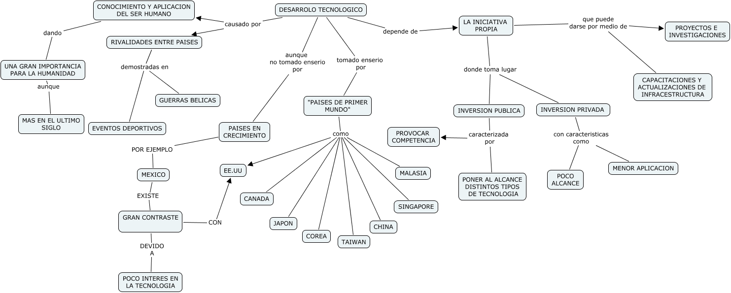 Este Cmap, tiene información relacionada con: VICTORIA MOSQUERA, "PAISES DE PRIMER MUNDO" como SINGAPORE, "PAISES DE PRIMER MUNDO" como JAPON, "PAISES DE PRIMER MUNDO" como COREA, RIVALIDADES ENTRE PAISES demostradas en EVENTOS DEPORTIVOS, "PAISES DE PRIMER MUNDO" como EE.UU, CONOCIMIENTO Y APLICACION DEL SER HUMANO dando UNA GRAN IMPORTANCIA PARA LA HUMANIDAD, INVERSION PUBLICA caracterizada por PROVOCAR COMPETENCIA, "PAISES DE PRIMER MUNDO" como TAIWAN, DESARROLO TECNOLOGICO causado por CONOCIMIENTO Y APLICACION DEL SER HUMANO, "PAISES DE PRIMER MUNDO" como CHINA, LA INICIATIVA PROPIA donde toma lugar INVERSION PRIVADA, DESARROLO TECNOLOGICO tomado enserio por "PAISES DE PRIMER MUNDO", INVERSION PRIVADA con caracteristicas como POCO ALCANCE, GRAN CONTRASTE CON EE.UU, DESARROLO TECNOLOGICO aunque no tomado enserio por PAISES EN CRECIMIENTO, INVERSION PUBLICA caracterizada por PONER AL ALCANCE DISTINTOS TIPOS DE TECNOLOGIA, LA INICIATIVA PROPIA donde toma lugar INVERSION PUBLICA, LA INICIATIVA PROPIA que puede darse por medio de PROYECTOS E INVESTIGACIONES, LA INICIATIVA PROPIA que puede darse por medio de CAPACITACIONES Y ACTUALIZACIONES DE INFRACESTRUCTURA, PAISES EN CRECIMIENTO POR EJEMPLO MEXICO