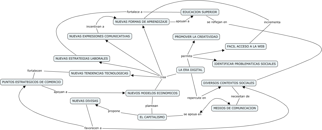 Este Cmap, tiene información relacionada con: ALEJANDRA TORIJANO OVIEDO, LA ERA DIGITAL crea NUEVAS FORMAS DE APRENDIZAJE, LA ERA DIGITAL permite PROMOVER LA CREATIVIDAD, LA ERA DIGITAL crea NUEVAS ESTRATEGIAS LABORALES, NUEVAS FORMAS DE APRENDIZAJE apoyan a EDUCACION SUPERIOR, NUEVOS MODELOS ECONOMICOS plantean EL CAPITALISMO, DIVERSOS CONTEXTOS SOCIALES necesitan de MEDIOS DE COMUNICACION, NUEVAS TENDENCIAS TECNOLOGICAS fortalecen PUNTOS ESTRATEGICOS DE COMERCIO, FACIL ACCESO A LA WEB incrementa NUEVAS FORMAS DE APRENDIZAJE, NUEVAS DIVISAS favorecen a DIVERSOS CONTEXTOS SOCIALES, LA ERA DIGITAL permite FACIL ACCESO A LA WEB, LA ERA DIGITAL repercute en DIVERSOS CONTEXTOS SOCIALES, LA ERA DIGITAL crea NUEVAS TENDENCIAS TECNOLOGICAS, NUEVAS DIVISAS favorecen a PUNTOS ESTRATEGICOS DE COMERCIO, LA ERA DIGITAL crea NUEVAS EXPRESIONES COMUNICATIVAS, NUEVAS EXPRESIONES COMUNICATIVAS incentivan a NUEVAS FORMAS DE APRENDIZAJE, EL CAPITALISMO se apoya en MEDIOS DE COMUNICACION, PUNTOS ESTRATEGICOS DE COMERCIO apoyan a NUEVOS MODELOS ECONOMICOS, EL CAPITALISMO propone NUEVAS DIVISAS, LA ERA DIGITAL permite IDENTIFICAR PROBLEMATICAS SOCIALES, EDUCACION SUPERIOR se reflejan en DIVERSOS CONTEXTOS SOCIALES