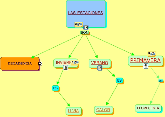 Este mapa conceptual tiene información relacionada a: LAS ESTACIONES, OTOÑO ES DECADENCIA VEGETAL, LAS ESTACIONES SON PRIMAVERA, VERANO ES CALOR, INVIERNO ES LLVIA, LAS ESTACIONES SON INVIERNO, LAS ESTACIONES SON OTOÑO, LAS ESTACIONES SON VERANO, PRIMAVERA es FLORECENIA