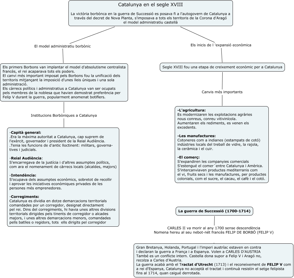 Este Cmap, tiene información relacionada con: tema 1 part 6, Els primers Borbons van implantar el model d'absolutisme centralista francès, el rei acaparava tots els poders. El canvi més important imposat pels Borbons fou la unificació dels territoris mitjançant la imposició d'unes lleis úniques i una sola administració. Els càrrecs polítics i administratius a Catalunya van ser ocupats pels membres de la noblesa que havien demostrat preferència per Felip V durant la guerra, popularment anomenat botiflers. Institucions Borbòniques a Catalunya -Capità general: .Era la màxima autoritat a Catalunya, cap suprem de l'exèrcit, governador i president de la Reial Audiència. .Tenia les funcions de d'antic lloctinent: militars, governa- tives i judicials. -Reial Audiència: S'encarregava de la justícia i d'altres assumptes polítics, com ara el nomenament de càrrecs locals (alcaldes, majors) -Intendència: S'ocupava dels assumptes econòmics, sobretot de recollir i aprovar les iniciatives econòmiques privades de les persones més emprenedores. -Corregiments: Catalunya es dividia en dotze demarcacions territorials comandades por un corregidor, designat directament pel rei. Dins del corregiments, hi havia unes altres divisions territorials dirigides pels tinents de corregidor o alcades majors, i unes altres demarcacions menors, comandades pells batlles o regidors, tots ells dirigits pel corregidor, Catalunya en el segle XVIII La victòria borbònca en la guerra de Successió es posava fi a l'autogovern de Catalunya a través del decret de Nova Planta, s'imposava a tots els territoris de la Corona d'Aragó el model administratiu castellà El model administratiu borbònic Els primers Borbons van implantar el model d'absolutisme centralista francès, el rei acaparava tots els poders. El canvi més important imposat pels Borbons fou la unificació dels territoris mitjançant la imposició d'unes lleis úniques i una sola administració. Els càrrecs polítics i administratius a Catalunya van ser ocupats pels membres de la noblesa que havien demostrat preferència per Felip V durant la guerra, popularment anomenat botiflers., Segle XVIII fou una etapa de creixement econòmic per a Catalunya Canvis més importants -L'agricultura: Es modernizaren les explotacions agràries nous conreus, conreu vitivinícola. Aumentaren els rediments, es venen els excedents. -Les manufactures: Cotoneres com a indianes (estampats de cotó) indústries locals del treball de vidre, la rajola, la ceràmica i el cuir. -El comerç: S'expandiren les companyies comercials S'estengué el comer´entre Catalunya i Amèrica. S'intercanviaven productes mediterranis com el vi, fruits secs i les manufactures, per productes colonials, com el sucre, el cacau, el cafè i el cotó., Catalunya en el segle XVIII La victòria borbònca en la guerra de Successió es posava fi a l'autogovern de Catalunya a través del decret de Nova Planta, s'imposava a tots els territoris de la Corona d'Aragó el model administratiu castellà Els inicis de l 'expansió econòmica Segle XVIII fou una etapa de creixement econòmic per a Catalunya, La guerra de Successió (1700-1714) CARLES II va morir al any 1700 sense descendència Nomena hereu al seu nebot-nét francès FELIP DE BORBÓ (FELIP V) Gran Bretanya, Holanda, Portugal i l'imperi austríac estaven en contra i declaran la guerra a França i a Espanya. Volen a CARLES D'AUSTRIA També es un conflicte intern. Castella dona supor a Felip V i Aragó no, recolza a Carles d'Austria. La guerra acabà amb el Tractat d'Utrecht (1713) i el reconeixement de FELIP V com a rei d'Espanya, Catalunya no acceptà el tractat i continuà resistin el setge felipista fins al 1714, quan caigué derrotada.