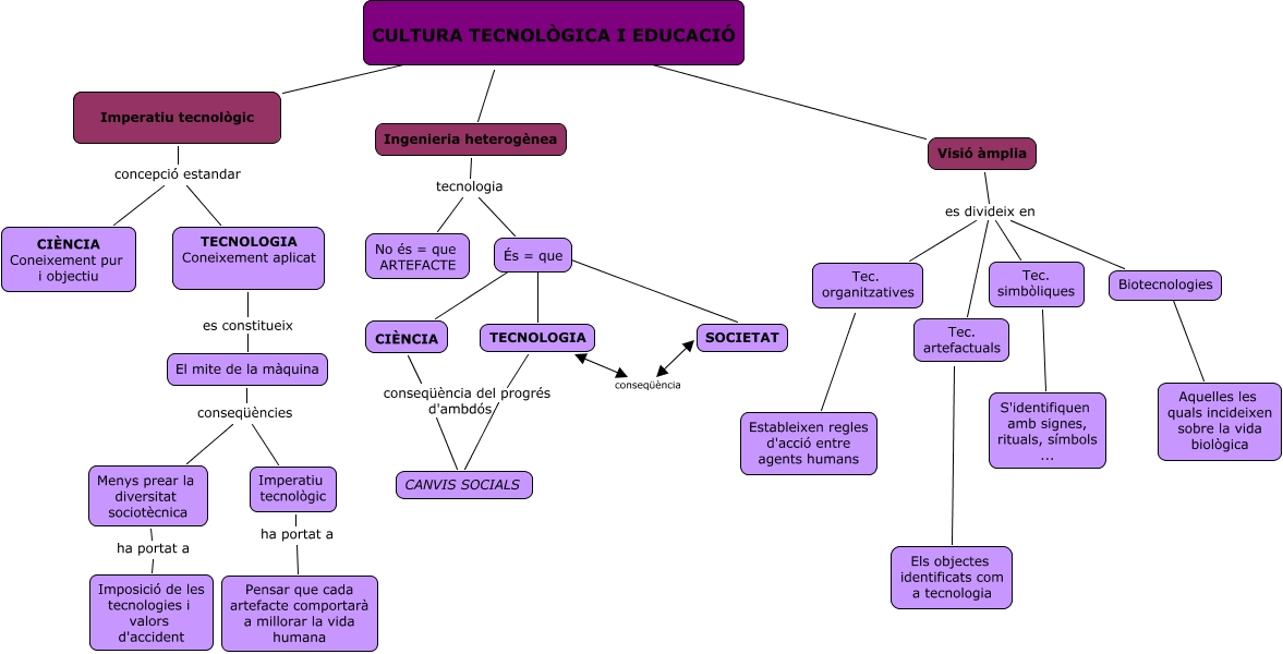 Este mapa conceptual tiene información relacionada a: Cultura tecnològica i educació, Imperatiu tecnològic concepció estandar TECNOLOGIA Coneixement aplicat, CULTURA TECNOLÒGICA I EDUCACIÓ Ingenieria heterogènea, Menys prear la diversitat sociotècnica ha portat a Imposició de les tecnologies i valors d'accident, Biotecnologies Aquelles les quals incideixen sobre la vida biològica, Visió àmplia es divideix en Biotecnologies, És = que SOCIETAT, Tec. organitzatives Estableixen regles d'acció entre agents humans, Ingenieria heterogènea tecnologia No és = que ARTEFACTE, És = que TECNOLOGIA, Tec. artefactuals Els objectes identificats com a tecnologia, CULTURA TECNOLÒGICA I EDUCACIÓ Visió àmplia, El mite de la màquina conseqüències Menys prear la diversitat sociotècnica, Visió àmplia es divideix en Tec. artefactuals, Tec. simbòliques S'identifiquen amb signes, rituals, símbols ..., Imperatiu tecnològic concepció estandar CIÈNCIA Coneixement pur i objectiu, CANVIS SOCIALS conseqüència del progrés d'ambdós CIÈNCIA, És = que CIÈNCIA, CULTURA TECNOLÒGICA I EDUCACIÓ Imperatiu tecnològic, Ingenieria heterogènea tecnologia És = que, Visió àmplia es divideix en Tec. organitzatives