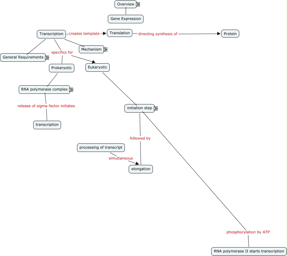 This Concept Map, created with IHMC CmapTools, has information related to: Gene Expression2, Nitrogenous Bases structurally either Pyrimidine, Transcription and Translation, 3 essential regions start point +1 of gene, Translation to generate Protein, ready for start of elongation phosphorylation by ATP RNA polymerase II starts transcription, Step 1 Initiation Promoter, Single strand of Helix to create mRNA, binds to DNA and associated TFII's TFIIE and TFIIH bind to polymerase complex ready for start of elongation, 3 essential regions conserved -35 sequence, Single strand of Helix to create tRNA, Purine double-ring ATP, Translation directing synthesis of Protein, RNA polymerase binds to promoter region on recognized in helical double-stranded form, Step 2 Elongation RNA Polymerase Driven, Nucleoside triphosphates are composed of Ribose Sugar, RNA Polymerase II Primary one for mRNA must be associated with TFIIF binds to DNA and associated TFII's, promoters are first recognized by and bound by transcription factors Sequence of Transcription factors: A, B, D, E, F, and H binding TFIID recognizes TATA box on DNA template, RNA polymerase complexes are all multimeric proteins designated as: RNA Polymerase II Primary one for mRNA, Eukaryotic has three specific proteins RNA polymerase complexes are all multimeric proteins, Single strand of Helix to create rRNA