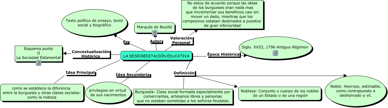 Este Cmap, tiene información relacionada con: comentario de texto 2, LA DESECREDITACIÓN EDUCATIVA Concextualización Histórica Esquema punto II La Sociedad Estamental, LA DESECREDITACIÓN EDUCATIVA Idea Principal como se establece la diferencia entre la burguesía y otras clases sociales: como la nobeza, LA DESECREDITACIÓN EDUCATIVA Autor Marqués de Bouillé, LA DESECREDITACIÓN EDUCATIVA Definición Noble: Honroso, estimable, como contrapuesto a deshonrado y vil., LA DESECREDITACIÓN EDUCATIVA Idea Secundaria privilegios en virtud de sus nacimientos, LA DESECREDITACIÓN EDUCATIVA Es Texto político de ensayo, texto social y biográfico, LA DESECREDITACIÓN EDUCATIVA Valoración Personal No estoy de acuerdo porque las ideas de los burgueses eran nada mas que incrementar sus beneficios casi sin mover un dedo, mientras que los campesinos estaban destinados a puestos de gran inferioridad, LA DESECREDITACIÓN EDUCATIVA Definición Burguesía: Clase social formada especialmente por comerciantes, artesanos libres y personas que no estaban sometidas a los señores feudales., LA DESECREDITACIÓN EDUCATIVA Definición Nobleza: Conjunto o cuerpo de los nobles de un Estado o de una región, LA DESECREDITACIÓN EDUCATIVA Época Histórica Siglo. XVIII, 1796 Antiguo Régimen