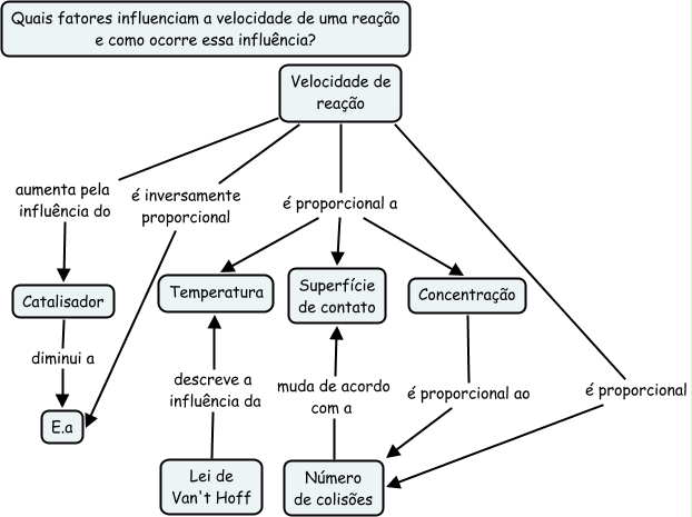 This Concept Map, created with IHMC CmapTools, has information related to: velocidade I 2B, Velocidade de reação é proporcional a Concentração, Velocidade de reação é inversamente proporcional E.a, Número de colisões muda de acordo com a Superfície de contato, Velocidade de reação é proporcional Número de colisões, Lei de Van't Hoff descreve a influência da Temperatura, Catalisador diminui a E.a, Velocidade de reação é proporcional a Superfície de contato, Concentração é proporcional ao Número de colisões, Velocidade de reação aumenta pela influência do Catalisador, Velocidade de reação é proporcional a Temperatura