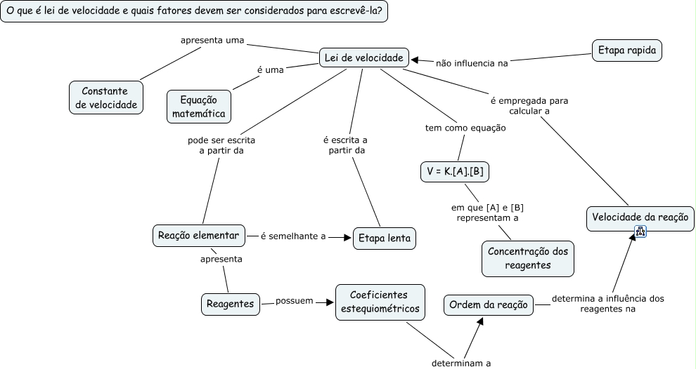 Esse mapa conceitual, produzido no IHMC CmapTools, tem a informação relacionada a: Velocidade II 2C, V = K.[A].[B] em que [A] e [B] representam a Concentração dos reagentes, Reação elementar é semelhante a Etapa lenta, Coeficientes estequiométricos determinam a Ordem da reação, Lei de velocidade tem como equação V = K.[A].[B], Lei de velocidade pode ser escrita a partir da Reação elementar, Lei de velocidade é empregada para calcular a Velocidade da reação, Lei de velocidade é uma Equação matemática, Etapa rapida não influencia na Lei de velocidade, Lei de velocidade é escrita a partir da Etapa lenta, Reagentes possuem Coeficientes estequiométricos, Lei de velocidade apresenta uma Constante de velocidade, Ordem da reação determina a influência dos reagentes na Velocidade da reação, Reação elementar apresenta Reagentes