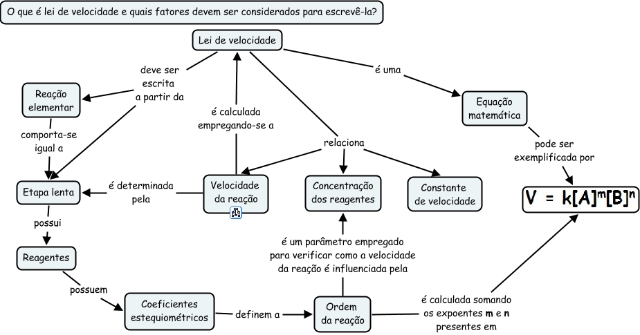 This Concept Map, created with IHMC CmapTools, has information related to: Velocidade II 2B, Lei de velocidade relaciona Velocidade da reação, Etapa lenta possui Reagentes, Reação elementar comporta-se igual a Etapa lenta, Lei de velocidade relaciona Concentração dos reagentes, Ordem da reação é um parâmetro empregado para verificar como a velocidade da reação é influenciada pela Concentração dos reagentes, Coeficientes estequiométricos definem a Ordem da reação, Lei de velocidade relaciona Constante de velocidade, Reagentes possuem Coeficientes estequiométricos, Lei de velocidade é uma Equação matemática, Ordem da reação é calculada somando os expoentes m e n presentes em, Velocidade da reação é calculada empregando-se a Lei de velocidade, Lei de velocidade deve ser escrita a partir da Etapa lenta, Lei de velocidade deve ser escrita a partir da Reação elementar, Velocidade da reação é determinada pela Etapa lenta, Equação matemática pode ser exemplificada por