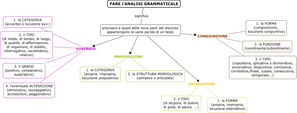 Questa Cmap, creata con IHMC CmapTools, contiene informazioni relative a: fare l'analisi grammaticale_p_invariabili, precisare a quale delle nove parti del discorso appartengono le varie parole di un testo PREPOSIZIONE 1. la CATEGORIA (propria, impropria, locuzione prepositiva), precisare a quale delle nove parti del discorso appartengono le varie parole di un testo INTERAZIONE 2. il TIPO (di stupore, di dolore, di gioia, di paura, ...), precisare a quale delle nove parti del discorso appartengono le varie parole di un testo CONGIUNZIONE 3. il TIPO (copulativa, splicativa o dichiarativa, avversativa, disgiuntiva, conclusiva, correlativa,finale, cusale, consecutiva, temporale...), precisare a quale delle nove parti del discorso appartengono le varie parole di un testo AVVERBIO 1. la CATEGORIA (avverbio o locuzione avv.), precisare a quale delle nove parti del discorso appartengono le varie parole di un testo AVVERBIO 3. il GRADO (positivo, comparativo, superlativo), precisare a quale delle nove parti del discorso appartengono le varie parole di un testo PREPOSIZIONE 2. la STRUTTURA MORFOLOGICA (semplice o articolata), precisare a quale delle nove parti del discorso appartengono le varie parole di un testo AVVERBIO 2. il TIPO (di modo, di tempo, di luogo, di qualità, di affermazione, di negazione, di dubbio, interrogativo, esclamativo, relativo), precisare a quale delle nove parti del discorso appartengono le varie parole di un testo AVVERBIO 4. l'eventuale ALTERAZIONE (diminutivo, vezzeggiativo, accrescitivo, peggiorativo), precisare a quale delle nove parti del discorso appartengono le varie parole di un testo INTERAZIONE 1. la FORMA (propria, impropria, locuzione interiettiva), FARE l'ANALISI GRAMMATICALE significa precisare a quale delle nove parti del discorso appartengono le varie parole di un testo, precisare a quale delle nove parti del discorso appartengono le varie parole di un testo CONGIUNZIONE 1. la FORMA (congiunzione, locuzione congiuntiva), precisare a quale delle nove parti del discorso appartengono le varie parole di un testo CONGIUNZIONE 2. la FUNZIONE (coordinante/subordinante)