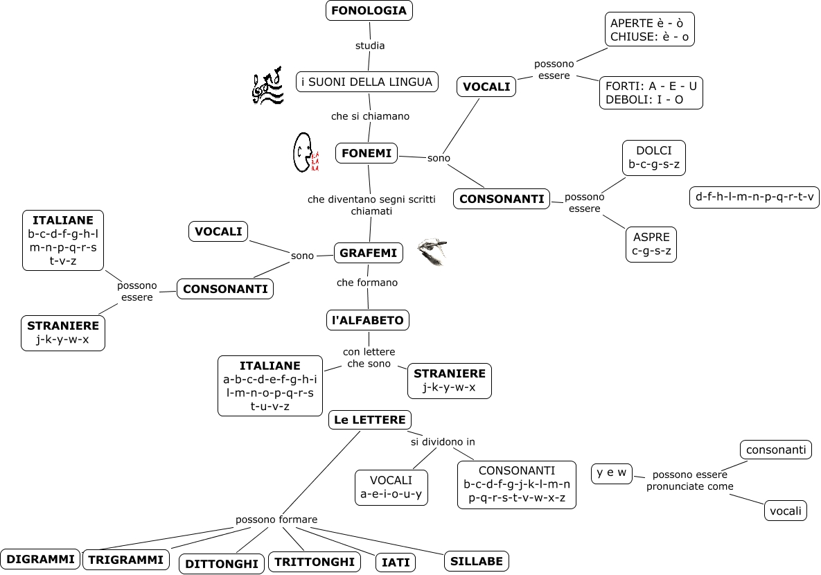 Questa Cmap, creata con IHMC CmapTools, contiene informazioni relative a: 1.fonologia, Le LETTERE possono formare IATI, FONEMI sono VOCALI, Le LETTERE possono formare DITTONGHI, i SUONI DELLA LINGUA che si chiamano FONEMI, FONEMI sono CONSONANTI, Le LETTERE si dividono in VOCALI a-e-i-o-u-y, Le LETTERE si dividono in CONSONANTI b-c-d-f-g-j-k-l-m-n p-q-r-s-t-v-w-x-z, CONSONANTI possono essere ASPRE c-g-s-z, VOCALI possono essere FORTI: A - E - U DEBOLI: I - O, VOCALI possono essere APERTE è - ò CHIUSE: è - o, CONSONANTI possono essere ITALIANE b-c-d-f-g-h-l m-n-p-q-r-s t-v-z, l'ALFABETO con lettere che sono ITALIANE a-b-c-d-e-f-g-h-i l-m-n-o-p-q-r-s t-u-v-z, Le LETTERE possono formare SILLABE, Le LETTERE possono formare TRITTONGHI, y e w possono essere pronunciate come consonanti, CONSONANTI possono essere STRANIERE j-k-y-w-x, Le LETTERE possono formare DIGRAMMI, GRAFEMI sono CONSONANTI, GRAFEMI sono VOCALI, y e w possono essere pronunciate come vocali