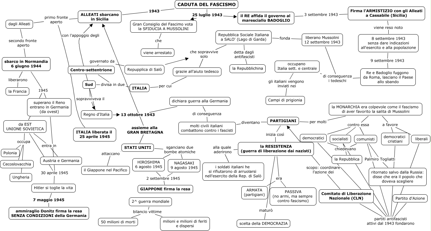 Questa Cmap, creata con IHMC CmapTools, contiene informazioni relative a: 2^_GM_Caduta_del_fascismo, sbarco in Normandia 6 giugno 1944 1945 da EST UNIONE SOVIETICA, grazie all'aiuto tedesco per cui ITALIA, CADUTA DEL FASCISMO 25 luglio 1943 il RE affida il governo al maresciallo BADOGLIO, la RESISTENZA (guerra di liberazione dai nazisti) maturò scelta della DEMOCRAZIA, PARTIGIANI per molti la MONARCHIA era colpevole come il fascismo di aver favorito la salita di Mussolini, ALLEATI sbarcano in Sicilia primo fronte aperto ITALIA liberata il 25 aprile 1945, STATI UNITI assieme alla GRAN BRETAGNA ALLEATI sbarcano in Sicilia, la RESISTENZA (guerra di liberazione dai nazisti) era PASSIVA (no armi, ma sempre contro fascismo), la MONARCHIA era colpevole come il fascismo di aver favorito la salita di Mussolini contro essa socialisti, Firma l'ARMISTIZIO con gli Alleati a Cassabile (Sicilia) viene reso noto 8 settembre 1943 senza dare indicazioni all'esercito e alla popolazione, ALLEATI sbarcano in Sicilia primo fronte aperto dagli Alleati, da EST UNIONE SOVIETICA entra in Austria e Germania, da EST UNIONE SOVIETICA occupa Polonia, da EST UNIONE SOVIETICA occupa Cecoslovacchia, la MONARCHIA era colpevole come il fascismo di aver favorito la salita di Mussolini contro essa comunisti, CADUTA DEL FASCISMO 1943 ALLEATI sbarcano in Sicilia, il RE affida il governo al maresciallo BADOGLIO 3 settembre 1943 Firma l'ARMISTIZIO con gli Alleati a Cassabile (Sicilia), democratici chiedevano la Repubblica, la MONARCHIA era colpevole come il fascismo di aver favorito la salita di Mussolini contro essa democratici, 2^ guerra mondiale bilancio vittime milioni e milioni di feriti e dispersi