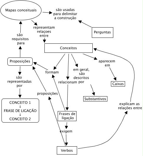 Esse mapa conceitual, produzido no IHMC CmapTools, tem a informação relacionada a: fer, Frases de ligação exigem Verbos, Conceitos em geral, são descritos por Substantivos, Conceitos formam Proposições, Verbos proposições Proposições, Mapas conceituais representam relaçoes entre Conceitos, Conceitos aparecem em Caixas, Proposições são requisitos para Mapas conceituais, Frases de ligação formam Proposições, Proposições são representadas por CONCEITO 1 ↓ FRASE DE LIGAÇÃO ↓ CONCEITO 2, Conceitos relacionam Frases de ligação, Verbos explicam as relações entre Conceitos