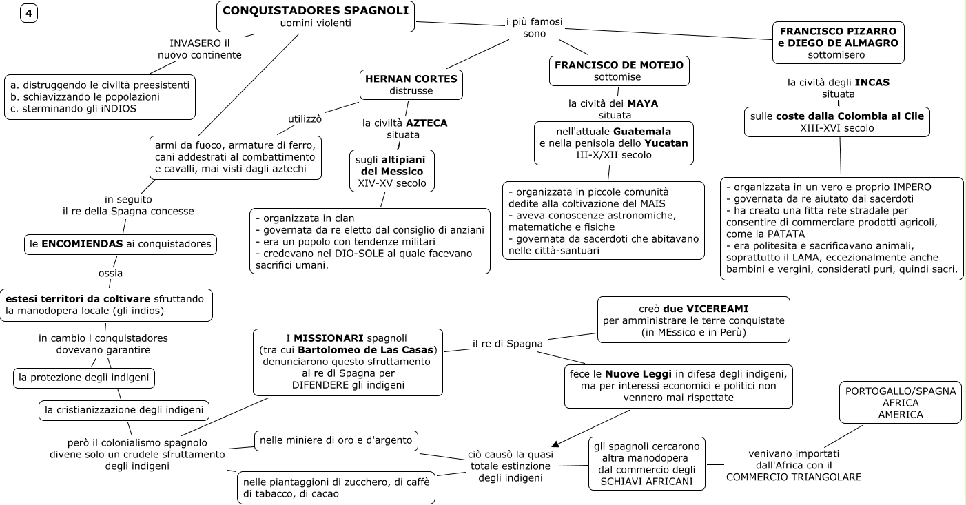Questa Cmap, creata con IHMC CmapTools, contiene informazioni relative a: 4.conquistadores, FRANCISCO PIZARRO e DIEGO DE ALMAGRO sottomisero la cività degli INCAS situata - organizzata in un vero e proprio IMPERO - governata da re aiutato dai sacerdoti - ha creato una fitta rete stradale per consentire di commerciare prodotti agricoli, come la PATATA - era politesita e sacrificavano animali, soprattutto il LAMA, eccezionalmente anche bambini e vergini, considerati puri, quindi sacri., nelle miniere di oro e d'argento ciò causò la quasi totale estinzione degli indigeni gli spagnoli cercarono altra manodopera dal commercio degli SCHIAVI AFRICANI, CONQUISTADORES SPAGNOLI uomini violenti INVASERO il nuovo continente a. distruggendo le civiltà preesistenti b. schiavizzando le popolazioni c. sterminando gli iNDIOS, gli spagnoli cercarono altra manodopera dal commercio degli SCHIAVI AFRICANI venivano importati dall'Africa con il COMMERCIO TRIANGOLARE PORTOGALLO/SPAGNA AFRICA AMERICA, la cristianizzazione degli indigeni però il colonialismo spagnolo divene solo un crudele sfruttamento degli indigeni nelle miniere di oro e d'argento, estesi territori da coltivare sfruttando la manodopera locale (gli indios) in cambio i conquistadores dovevano garantire la protezione degli indigeni, HERNAN CORTES distrusse la civiltà AZTECA situata - organizzata in clan - governata da re eletto dal consiglio di anziani - era un popolo con tendenze militari - credevano nel DIO-SOLE al quale facevano sacrifici umani., CONQUISTADORES SPAGNOLI uomini violenti i più famosi sono HERNAN CORTES distrusse, le ENCOMIENDAS ai conquistadores ossia estesi territori da coltivare sfruttando la manodopera locale (gli indios), la cristianizzazione degli indigeni però il colonialismo spagnolo divene solo un crudele sfruttamento degli indigeni I MISSIONARI spagnoli (tra cui Bartolomeo de Las Casas) denunciarono questo sfruttamento al re di Spagna per DIFENDERE gli indigeni, estesi territori da coltivare sfruttando la manodopera locale (gli indios) in cambio i conquistadores dovevano garantire la cristianizzazione degli indigeni, FRANCISCO DE MOTEJO sottomise la cività dei MAYA situata nell'attuale Guatemala e nella penisola dello Yucatan III-X/XII secolo, nelle piantaggioni di zucchero, di caffè di tabacco, di cacao ciò causò la quasi totale estinzione degli indigeni gli spagnoli cercarono altra manodopera dal commercio degli SCHIAVI AFRICANI, I MISSIONARI spagnoli (tra cui Bartolomeo de Las Casas) denunciarono questo sfruttamento al re di Spagna per DIFENDERE gli indigeni il re di Spagna fece le Nuove Leggi in difesa degli indigeni, ma per interessi economici e politici non vennero mai rispettate, la cristianizzazione degli indigeni però il colonialismo spagnolo divene solo un crudele sfruttamento degli indigeni nelle piantaggioni di zucchero, di caffè di tabacco, di cacao, I MISSIONARI spagnoli (tra cui Bartolomeo de Las Casas) denunciarono questo sfruttamento al re di Spagna per DIFENDERE gli indigeni il re di Spagna creò due VICEREAMI per amministrare le terre conquistate (in MEssico e in Perù), HERNAN CORTES distrusse utilizzò armi da fuoco, armature di ferro, cani addestrati al combattimento e cavalli, mai visti dagli aztechi, fece le Nuove Leggi in difesa degli indigeni, ma per interessi economici e politici non vennero mai rispettate ciò causò la quasi totale estinzione degli indigeni gli spagnoli cercarono altra manodopera dal commercio degli SCHIAVI AFRICANI, HERNAN CORTES distrusse la civiltà AZTECA situata sugli altipiani del Messico XIV-XV secolo, CONQUISTADORES SPAGNOLI uomini violenti in seguito il re della Spagna concesse le ENCOMIENDAS ai conquistadores