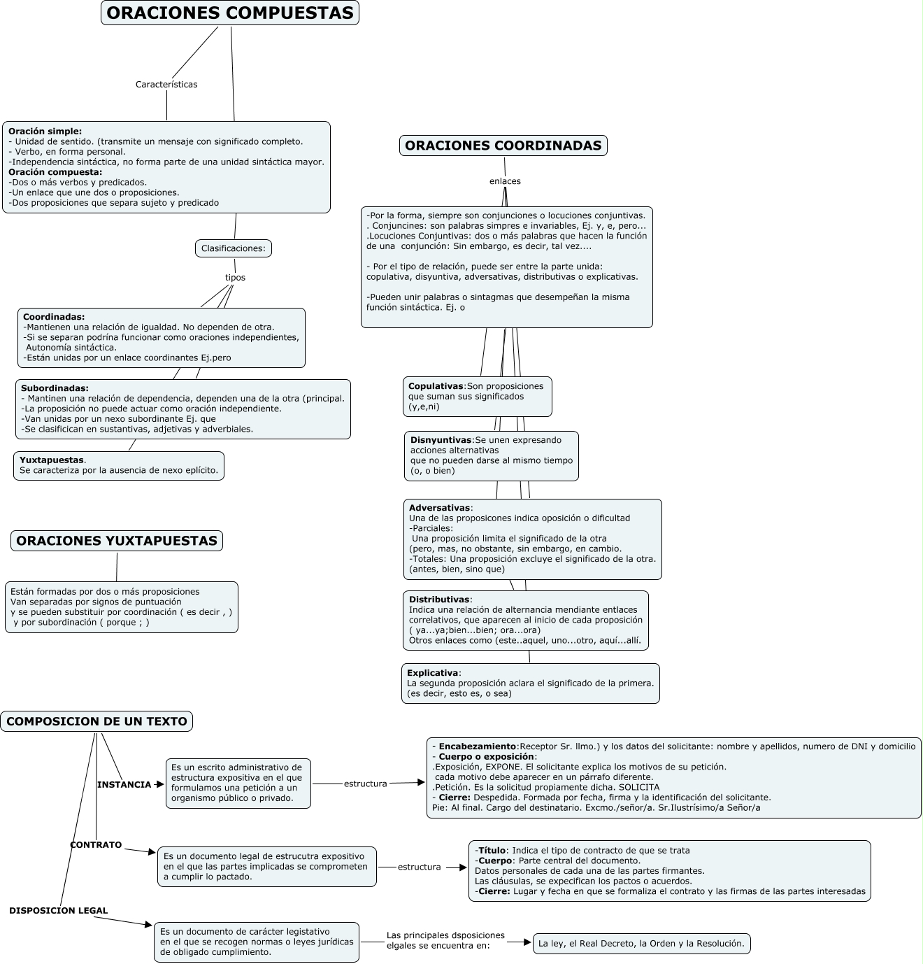 Este Cmap, tiene información relacionada con: Tema 3, ORACIONES COORDINADAS enlaces Copulativas:Son proposiciones que suman sus significados (y,e,ni), ORACIONES COORDINADAS enlaces -Por la forma, siempre son conjunciones o locuciones conjuntivas. . Conjuncines: son palabras simpres e invariables, Ej. y, e, pero... .Locuciones Conjuntivas: dos o más palabras que hacen la función de una conjunción: Sin embargo, es decir, tal vez.... - Por el tipo de relación, puede ser entre la parte unida: copulativa, disyuntiva, adversativas, distributivas o explicativas. -Pueden unir palabras o sintagmas que desempeñan la misma función sintáctica. Ej. o, Clasificaciones: tipos Coordinadas: -Mantienen una relación de igualdad. No dependen de otra. -Si se separan podrína funcionar como oraciones independientes, Autonomía sintáctica. -Están unidas por un enlace coordinantes Ej.pero, COMPOSICION DE UN TEXTO DISPOSICION LEGAL Es un documento de carácter legistativo en el que se recogen normas o leyes jurídicas de obligado cumplimiento., COMPOSICION DE UN TEXTO CONTRATO Es un documento legal de estrucutra expositivo en el que las partes implicadas se comprometen a cumplir lo pactado., ORACIONES COORDINADAS enlaces Adversativas: Una de las proposicones indica oposición o dificultad -Parciales: Una proposición limita el significado de la otra (pero, mas, no obstante, sin embargo, en cambio. -Totales: Una proposición excluye el significado de la otra. (antes, bien, sino que), ORACIONES COORDINADAS enlaces Explicativa: La segunda proposición aclara el significado de la primera. (es decir, esto es, o sea), Es un documento de carácter legistativo en el que se recogen normas o leyes jurídicas de obligado cumplimiento. Las principales dsposiciones elgales se encuentra en: La ley, el Real Decreto, la Orden y la Resolución., COMPOSICION DE UN TEXTO INSTANCIA Es un escrito administrativo de estructura expositiva en el que formulamos una petición a un organismo público o privado., Clasificaciones: tipos Yuxtapuestas. Se caracteriza por la ausencia de nexo eplícito., Es un escrito administrativo de estructura expositiva en el que formulamos una petición a un organismo público o privado. estructura - Encabezamiento:Receptor Sr. llmo.) y los datos del solicitante: nombre y apellidos, numero de DNI y domicilio - Cuerpo o exposición: .Exposición, EXPONE. El solicitante explica los motivos de su petición. cada motivo debe aparecer en un párrafo diferente. .Petición. Es la solicitud propiamente dicha. SOLICITA - Cierre: Despedida. Formada por fecha, firma y la identificación del solicitante. Pie: Al final. Cargo del destinatario. Excmo./señor/a. Sr.Ilustrísimo/a Señor/a, Es un documento legal de estrucutra expositivo en el que las partes implicadas se comprometen a cumplir lo pactado. estructura -Título: Indica el tipo de contracto de que se trata -Cuerpo: Parte central del documento. Datos personales de cada una de las partes firmantes. Las cláusulas, se expecifican los pactos o acuerdos. -Cierre: Lugar y fecha en que se formaliza el contrato y las firmas de las partes interesadas, -Por la forma, siempre son conjunciones o locuciones conjuntivas. . Conjuncines: son palabras simpres e invariables, Ej. y, e, pero... .Locuciones Conjuntivas: dos o más palabras que hacen la función de una conjunción: Sin embargo, es decir, tal vez.... - Por el tipo de relación, puede ser entre la parte unida: copulativa, disyuntiva, adversativas, distributivas o explicativas. -Pueden unir palabras o sintagmas que desempeñan la misma función sintáctica. Ej. o ???? Disnyuntivas:Se unen expresando acciones alternativas que no pueden darse al mismo tiempo (o, o bien), -Por la forma, siempre son conjunciones o locuciones conjuntivas. . Conjuncines: son palabras simpres e invariables, Ej. y, e, pero... .Locuciones Conjuntivas: dos o más palabras que hacen la función de una conjunción: Sin embargo, es decir, tal vez.... - Por el tipo de relación, puede ser entre la parte unida: copulativa, disyuntiva, adversativas, distributivas o explicativas. -Pueden unir palabras o sintagmas que desempeñan la misma función sintáctica. Ej. o ???? Distributivas: Indica una relación de alternancia mendiante entlaces correlativos, que aparecen al inicio de cada proposición ( ya...ya;bien...bien; ora...ora) Otros enlaces como (este..aquel, uno...otro, aquí...allí., ORACIONES COMPUESTAS Características Oración simple: - Unidad de sentido. (transmite un mensaje con significado completo. - Verbo, en forma personal. -Independencia sintáctica, no forma parte de una unidad sintáctica mayor. Oración compuesta: -Dos o más verbos y predicados. -Un enlace que une dos o proposiciones. -Dos proposiciones que separa sujeto y predicado, ORACIONES YUXTAPUESTAS ???? Están formadas por dos o más proposiciones Van separadas por signos de puntuación y se pueden substituir por coordinación ( es decir , ) y por subordinación ( porque ; ), Clasificaciones: tipos Subordinadas: - Mantinen una relación de dependencia, dependen una de la otra (principal. -La proposición no puede actuar como oración independiente. -Van unidas por un nexo subordinante Ej. que -Se clasificican en sustantivas, adjetivas y adverbiales., -Por la forma, siempre son conjunciones o locuciones conjuntivas. . Conjuncines: son palabras simpres e invariables, Ej. y, e, pero... .Locuciones Conjuntivas: dos o más palabras que hacen la función de una conjunción: Sin embargo, es decir, tal vez.... - Por el tipo de relación, puede ser entre la parte unida: copulativa, disyuntiva, adversativas, distributivas o explicativas. -Pueden unir palabras o sintagmas que desempeñan la misma función sintáctica. Ej. o ???? Adversativas: Una de las proposicones indica oposición o dificultad -Parciales: Una proposición limita el significado de la otra (pero, mas, no obstante, sin embargo, en cambio. -Totales: Una proposición excluye el significado de la otra. (antes, b