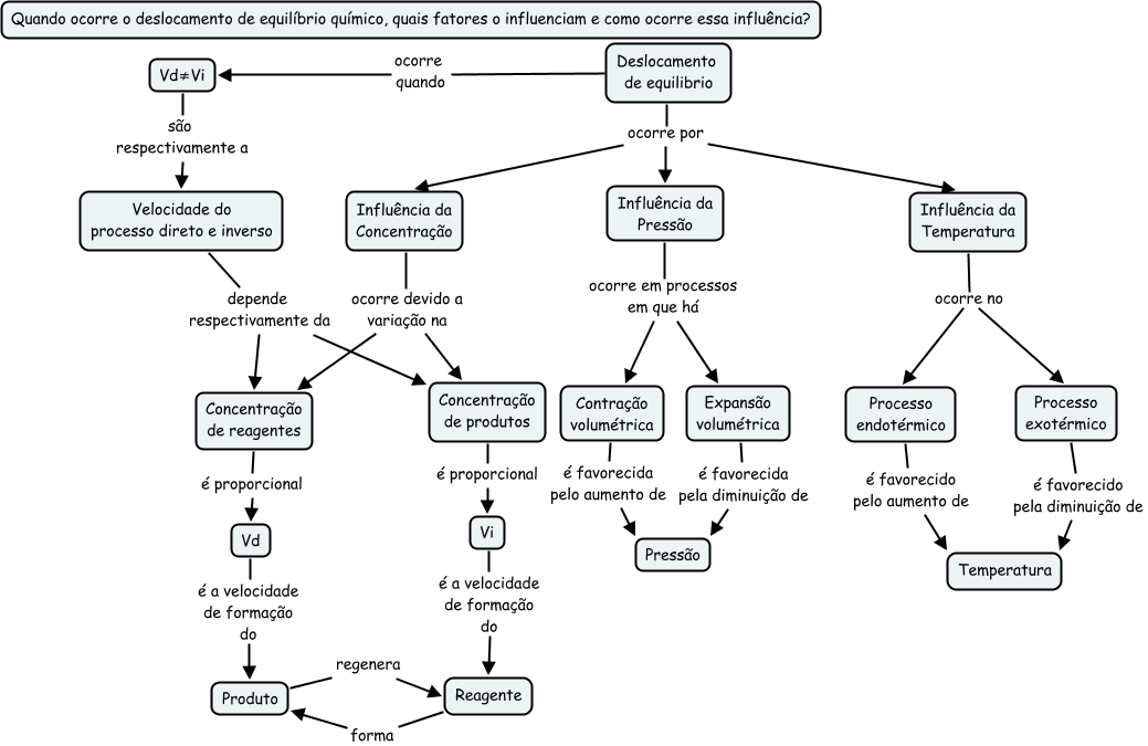 Esse mapa conceitual, produzido no IHMC CmapTools, tem a informação relacionada a: Deslocamento do equilibrio químico II, Influência da Pressão ocorre em processos em que há Expansão volumétrica, Processo exotérmico é favorecido pela diminuição de Temperatura, Influência da Temperatura ocorre no Processo endotérmico, Influência da Concentração ocorre devido a variação na Concentração de produtos, Deslocamento de equilibrio ocorre por Influência da Temperatura, Influência da Pressão ocorre em processos em que há Contração volumétrica, Produto regenera Reagente, Velocidade do processo direto e inverso depende respectivamente da Concentração de produtos, Deslocamento de equilibrio ocorre por Influência da Concentração, Deslocamento de equilibrio ocorre por Influência da Pressão, Vi é a velocidade de formação do Reagente, Processo endotérmico é favorecido pelo aumento de Temperatura, Deslocamento de equilibrio ocorre quando Vd≠Vi, Vd é a velocidade de formação do Produto, Velocidade do processo direto e inverso depende respectivamente da Concentração de reagentes, Influência da Concentração ocorre devido a variação na Concentração de reagentes, Concentração de reagentes é proporcional Vd, Vd≠Vi são respectivamente a Velocidade do processo direto e inverso, Influência da Temperatura ocorre no Processo exotérmico, Expansão volumétrica é favorecida pela diminuição de Pressão