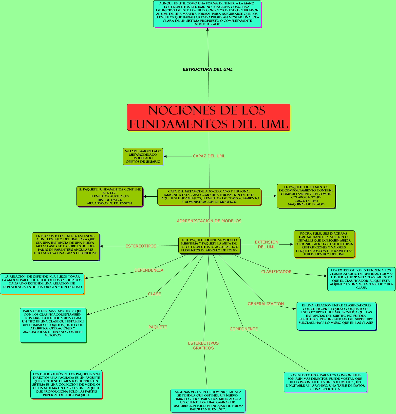 Este Cmap, tiene información relacionada con: david94, NOCIONES DE LOS FUNDAMENTOS DEL UML CAPAZ DEL UML METAMETAMODELADO METAMODELADO MODELADO OBJETOS DE USUARIO, CAPA DEL METAMODELADO:CERCANO Y PERSONAL IMAGINE A ESTA CAPA COMO UNA FORMACION DE TRES PAQUETES:FUNDAMENTOS, ELEMENTOS DE COMPORTAMIENTO Y ADMINISTRACION DE MODELOS. ???? EL PAQUETE DE ELEMENTOS DE COMPORTAMIENTO CONTIENE COMPORTAMIENTO EN COMUN COLABORACIONES CASOS DE USO MAQUINAS DE ESTADO, CAPA DEL METAMODELADO:CERCANO Y PERSONAL IMAGINE A ESTA CAPA COMO UNA FORMACION DE TRES PAQUETES:FUNDAMENTOS, ELEMENTOS DE COMPORTAMIENTO Y ADMINISTRACION DE MODELOS. ???? EL PAQUETE FUNDAMENTOS CONTIENE NUCLEO ELEMENTOS AUXILIARES TIPO DE DATOS MECANSMOS DE EXTENSION, NOCIONES DE LOS FUNDAMENTOS DEL UML ESTRUCTURA DEL UML AUNQUE ES UTIL COMO UNA FORMA DE TENER A LA MANO LOS ELEMENTOS DEL UML, NO FUNCIONA COMO UNA DEFINICION DE ESTE. LOS TRES CONECTORES ESTRUCTURARON AL UML DE UNA MANERA formaL PARA ASEGURARSE QUE LOS ELEMENTOS QUE HABIAN CREADO PUDIERAN MOSTAR UNA IDEA CLARA DE UN SISTEMA PROPUESTO O COMPLETAMENTE ESTRUCTURADO., NOCIONES DE LOS FUNDAMENTOS DEL UML CAPAZ DEL UML CAPA DEL METAMODELADO:CERCANO Y PERSONAL IMAGINE A ESTA CAPA COMO UNA FORMACION DE TRES PAQUETES:FUNDAMENTOS, ELEMENTOS DE COMPORTAMIENTO Y ADMINISTRACION DE MODELOS., CAPA DEL METAMODELADO:CERCANO Y PERSONAL IMAGINE A ESTA CAPA COMO UNA FORMACION DE TRES PAQUETES:FUNDAMENTOS, ELEMENTOS DE COMPORTAMIENTO Y ADMINISTRACION DE MODELOS. ADMISNISTACION DE MODELOS ESTE PAQUETE DEFINE AL MODELO SUBISTEMA Y PAQUETE LA META DE ESTOS ELEMENTOS ES AGRUPAR LOS ELEMENTOS DE MODELO DE TODO:, ESTE PAQUETE DEFINE AL MODELO SUBISTEMA Y PAQUETE LA META DE ESTOS ELEMENTOS ES AGRUPAR LOS ELEMENTOS DE MODELO DE TODO: CLASIFICADOR LOS EXTEREOTIPOS EXTIENDEN A LOS CLASIFICADORES DE DIVERSAS FORMAS EL ESTEREOTIPOP METACLASE MUESTRA QUE EL CLASIFICADOR AL QUE ESTA ADJUNTO ES UNA METACLASE DE OTRA CLASE., ESTE PAQUETE DEFINE AL MODELO SUBISTEMA Y PAQUETE LA META DE ESTOS ELEMENTOS ES AGRUPAR LOS ELEMENTOS DE MODELO DE TODO: PAQUETE LOS ESTEREOTIPÓS DE LOS PAQUETES SON DIRECTOS UNA FACHADA ES UN PAQUETE QUE CONTIENE ELEMENTOS PROPIOS UN SISTEMA ES UNA COLECCION DE MODELOS DE UN SISTEMA UN CABO ES UN PAQUETE QUE PROPORCIONA SOLO LAS PARTES PUBLICAS DE OTRO PAQUETE, ESTE PAQUETE DEFINE AL MODELO SUBISTEMA Y PAQUETE LA META DE ESTOS ELEMENTOS ES AGRUPAR LOS ELEMENTOS DE MODELO DE TODO: GENERALIZACION ES UNA RELACION ENTRE CLASIFICADORES CON SU PROPIO PEQUEÑO CONJUNTO DE ESTEREOTIPOS HEREDAR SIGNIFICA QUE LAS INSTANCIAS DEL SUBTIPO NO PUEDEN SUSTITUIRSE POR INSTANCIAS DEL SUPER TIPO SUBCLASE HACE LO MISMO QUE EN LAS CLASES, ESTE PAQUETE DEFINE AL MODELO SUBISTEMA Y PAQUETE LA META DE ESTOS ELEMENTOS ES AGRUPAR LOS ELEMENTOS DE MODELO DE TODO: EXTENSION DEL UML PODRA PULIR SUS DIAGRAMS UML MEDIANTE LA ADICION DE DETALLES QUE EXPLIQUEN MEJOR SU SIGNIFICADO. LOS ESTEREOTIPOS RESTRICCIONES Y VALORES ETIQUETADOS SON HERRAMIENTAS UTILES DENTRO DEL UML, ESTE PAQUETE DEFINE AL MODELO SUBISTEMA Y PAQUETE LA META DE ESTOS ELEMENTOS ES AGRUPAR LOS ELEMENTOS DE MODELO DE TODO: CLASE PARA OBTENER MAS ESPECIFICO QUE CON LOS CLASIFICADORES:TAMBIEN ES POSIBLE EXTENDER A UNA CLASE UN TIPO ES UNA CLASE QUE ESTABLECE UN DOMINIO DE OBJETOS JUNTO CON ATRIBUTOS OPERACIONES Y ASOCIACIOENS EL TIPO NO CONTIENE METODOS, ESTE PAQUETE DEFINE AL MODELO SUBISTEMA Y PAQUETE LA META DE ESTOS ELEMENTOS ES AGRUPAR LOS ELEMENTOS DE MODELO DE TODO: COMPONENTE LOS ESTEREOTIPOS PARA LOS COMPONENTES SON AUN MAS DIRECTOS. PUEDE MOSTAR QUE UN COMPONENETE ES UN DOCUMENTO , UN EJECUTABLE, UN ARCHIVO, UNA TABLE DE DATOS, O UNA BIBLIOTECA, ESTE PAQUETE DEFINE AL MODELO SUBISTEMA Y PAQUETE LA META DE ESTOS ELEMENTOS ES AGRUPAR LOS ELEMENTOS DE MODELO DE TODO: DEPENDENCIA LA RELACION DE DEPENDENCIA PUEDE TOMAR LA MAYOR PARTE DE ESTEREOTIPOS YA CREADOS CADA UNO EXTIENDE UNA RELACION DE DEPENDENCIA ENTRE UN ORIGEN Y U N DESTINO, ESTE PAQUETE DEFINE AL MODELO SUBISTEMA Y PAQUETE LA META DE ESTOS ELEMENTOS ES AGRUPAR LOS ELEMENTOS DE MODELO DE TODO: ESTEREOTIPOS GRAFICOS ALGUNAS VECES EN EL DOMINIO, TAL VEZ SE TENDRA QUE OBTENER UN NUEVO SIMBOLO O DOS PARA TRASMITIR ALGO A UN CLIENTE LOS DIAGRAMNAS DE DISTRIBUCION PUEDEN ENCAJAR DE FORMA IMPORTANTE EN ESTO., ESTE PAQUETE DEFINE AL MODELO SUBISTEMA Y PAQUETE LA META DE ESTOS ELEMENTOS ES AGRUPAR LOS ELEMENTOS DE MODELO DE TODO: ESTEREOTIPOS EL PROPOSITO DE ESTE ES EXTENDER A UN ELEMENTO DEL UML PARA QUE SEA UNA INSTANCIA DE UNA NUEVA METACLASE Y SE ESCRIBE ENTRE DOS PARES DE PARENTESIS ANGULARES ESTO AGREGA UNA GRAN FLEXIBILIDAD